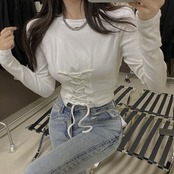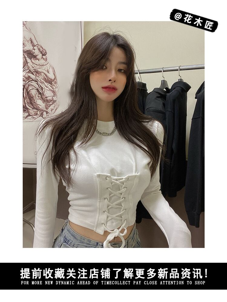 White long-sleeved T-shirt women's spring and autumn 2021 new design sense strap tight bottoming shirt all-match short top ショート ロング ホワイト スプリング 春物 オータム 秋物 Tシャツ 0921998590112401