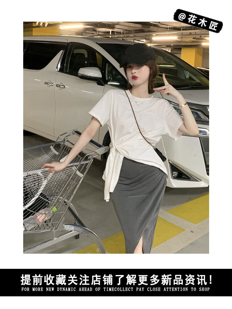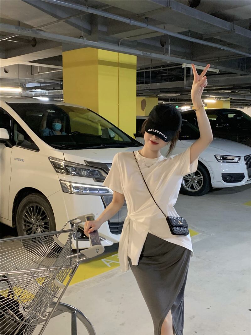 白い半袖Tシャツ女性2021年夏新しいデザインセンスパーソナリティ包帯ワイルドルーズミドル丈アッパー服 ホワイト サマー 夏物 09219413177767