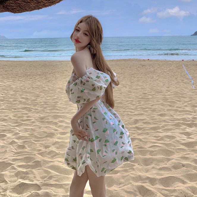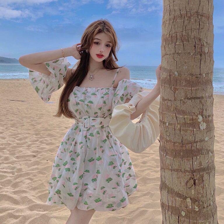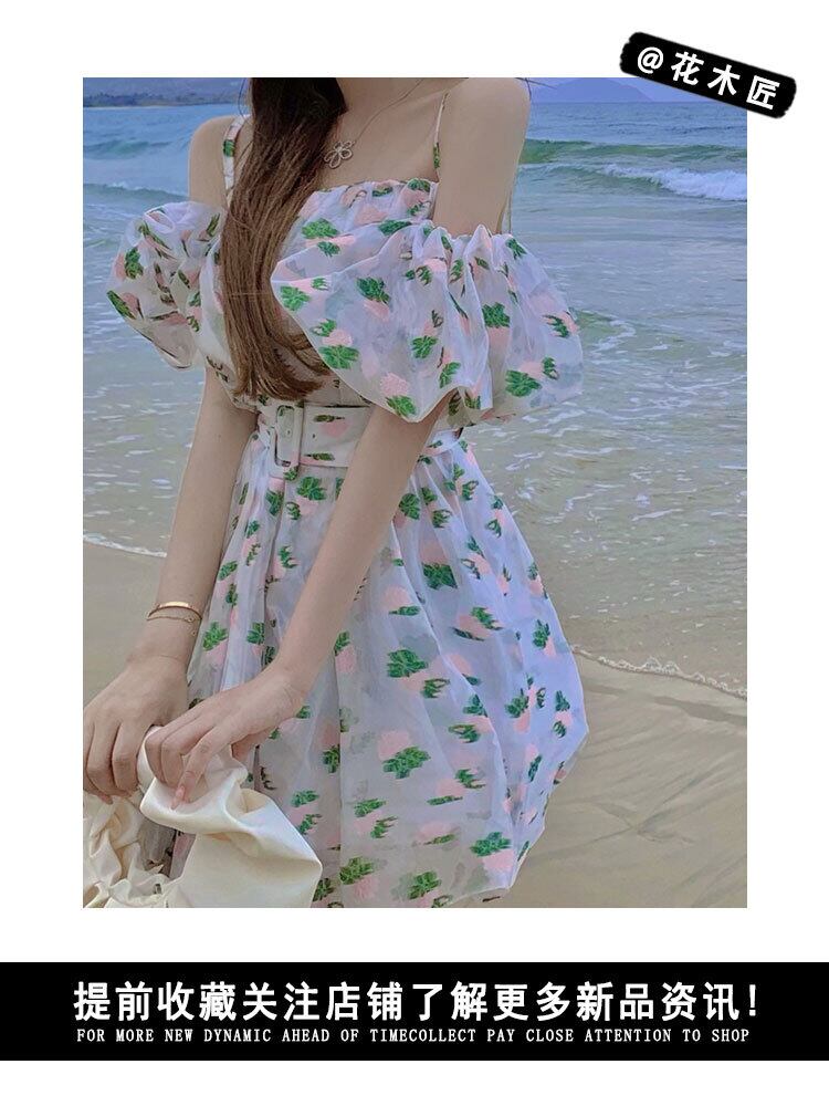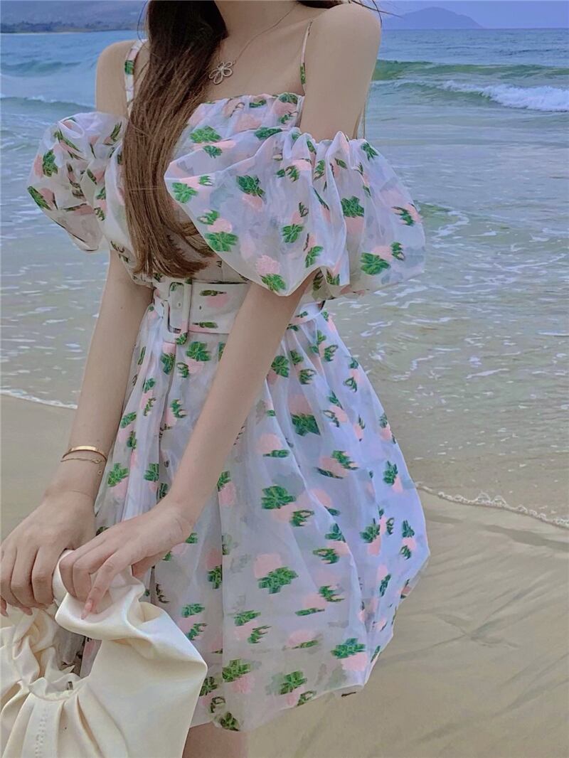 スリングドレスレディース2021年新夏デザインセンスワードショルダーパフスリーブフローラルスカートウエストバッドスカート サマー 夏物 花柄 0921958798016157