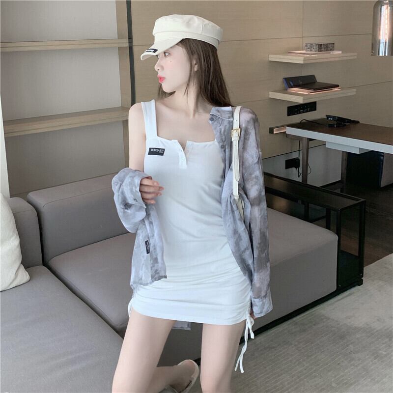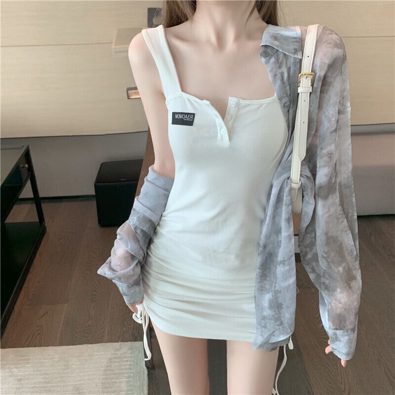 ホワイトサスペンダードレス女性2021年夏新デザインセンスドローストリングウエストセクシーバッグヒップショートスカート サマー 夏物 0921944002710087