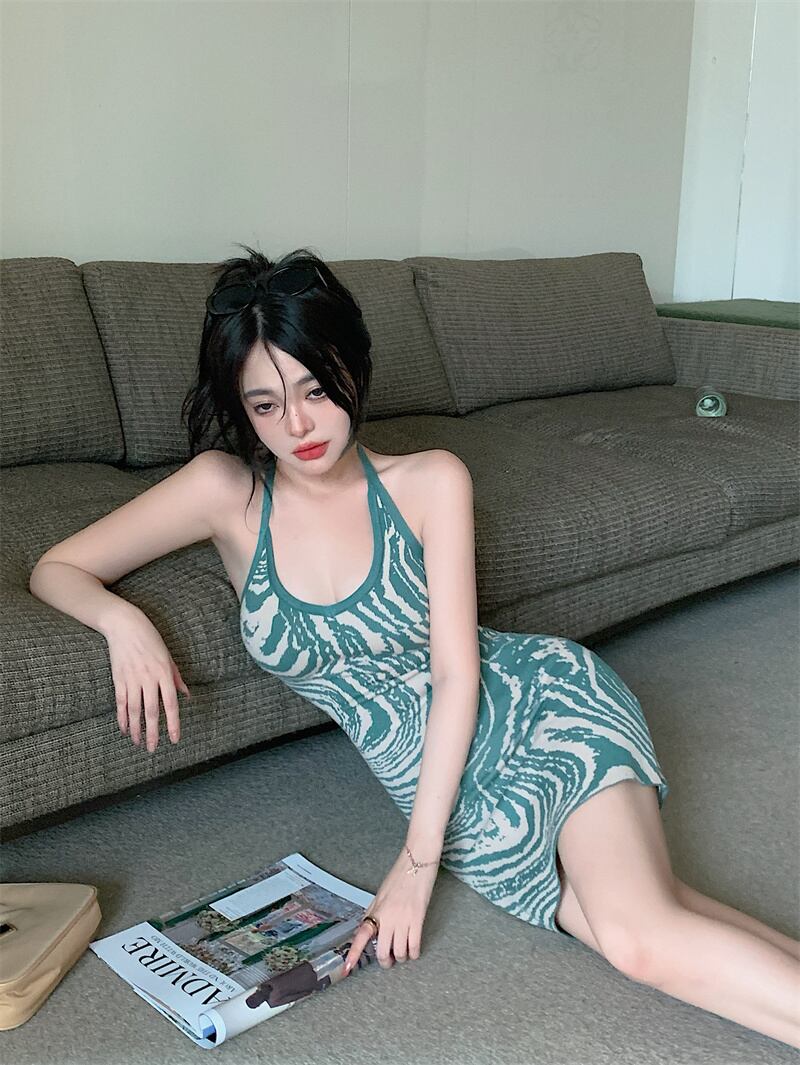 Sexy water ripple knitted halterneck dress women's summer 2022 new lace-up backless waist-length slim bag hip skirt レース サマー 夏物 スカート スリム レースアップ 0921938565943793