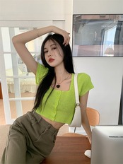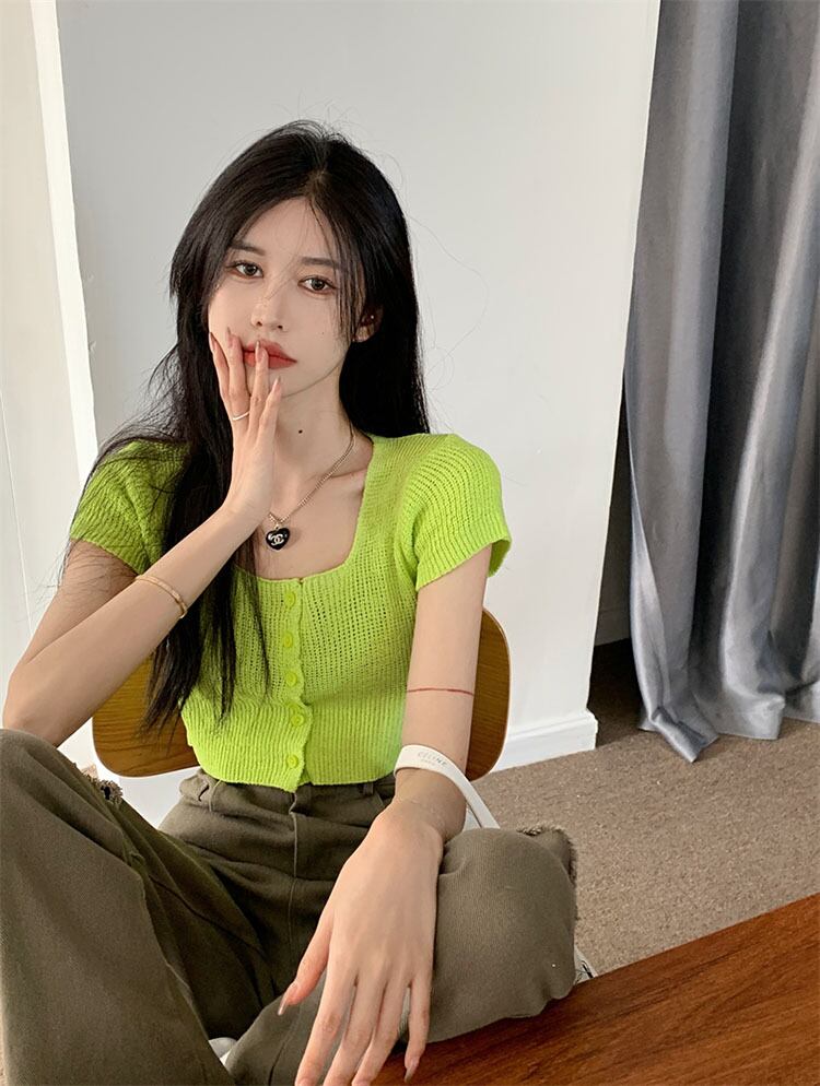 Hot green short-sleeved knitted cardigan women's summer 2022 new temperament square collar slim cropped navel short top trendy ショート カーディガン サマー 夏物 スリム グリーン スクウェア 0921988341188956