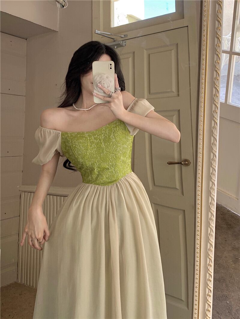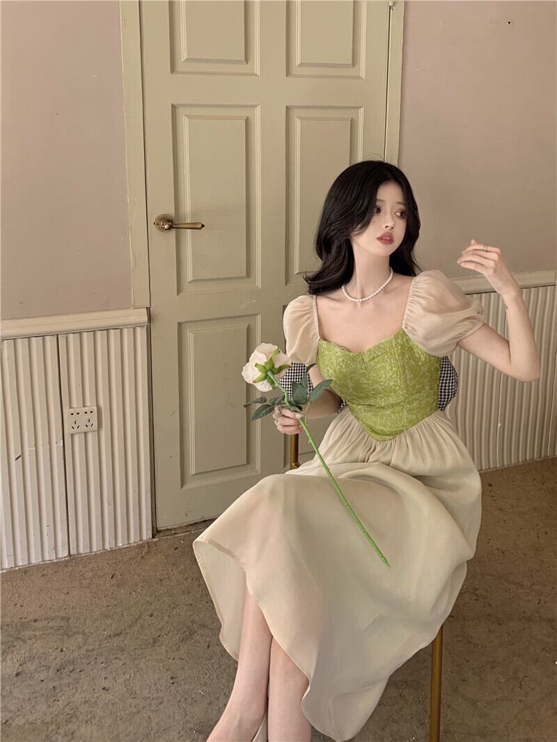 French Mori Contrast Color Puff Sleeve Dress Women's Summer 2022 -end Waist Mid-Length A-Line Skirt サマー 夏物 スカート Aライン 0921942213145817