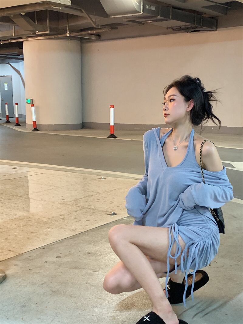 Blue long-sleeved T-shirt women's spring 2022 new fashion loose sunscreen shirt design sense niche hooded top trend ロング ブルー スプリング 春物 Tシャツ 0921986266732622