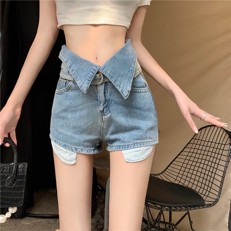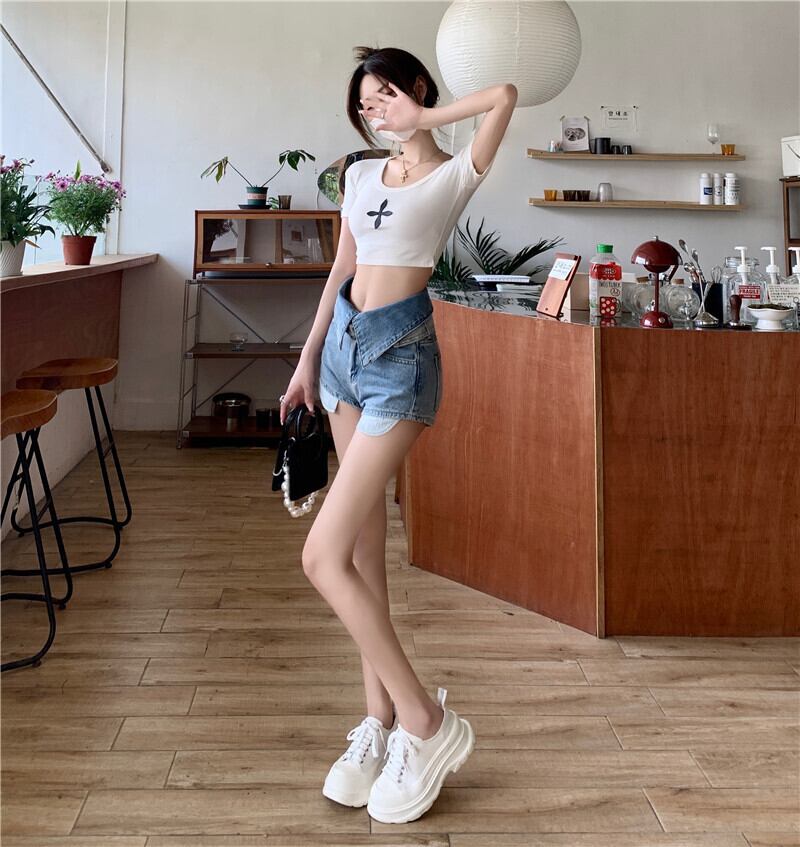 sense hit color irregular high waist jeans women's summer 2022 new fashion straight tube thin shorts ハイウェスト サマー 夏物 ショーツ ブルマー 0921911799161586
