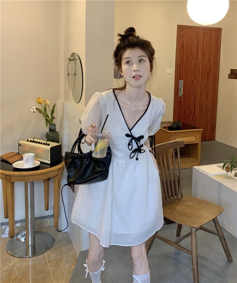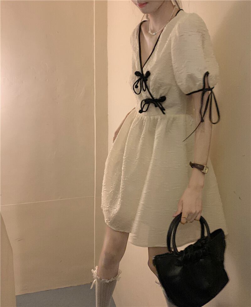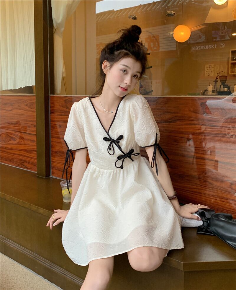Retro disc button v-neck puff sleeve dress women's summer 2022 new temperament small man waist thin a-line skirt レトロ サマー 夏物 スカート Vネック Aライン 0921928917881290