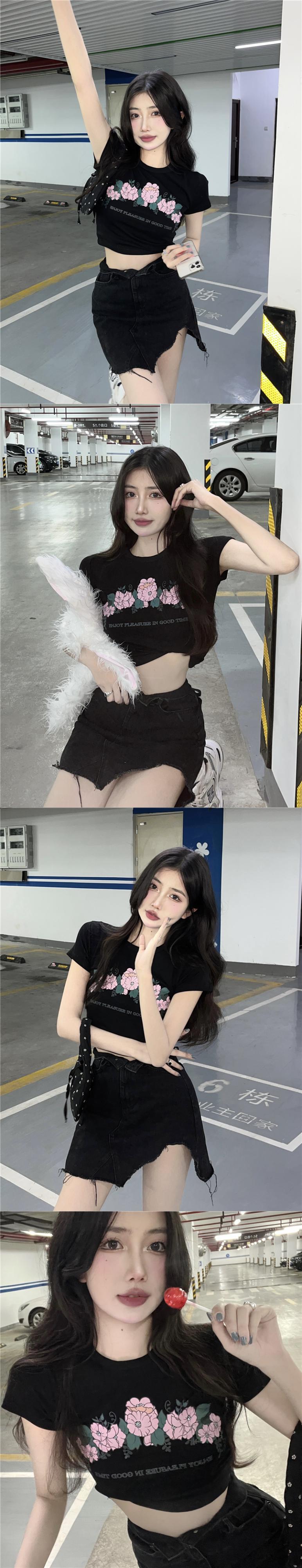 Chic flower print white short-sleeved t-shirt women's summer 2022 new slim fit and thin pure desire short top trendy ショート ホワイト サマー 夏物 スリム Tシャツ ピュア フラワーデザイン 0921912703991302