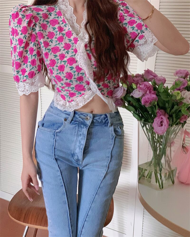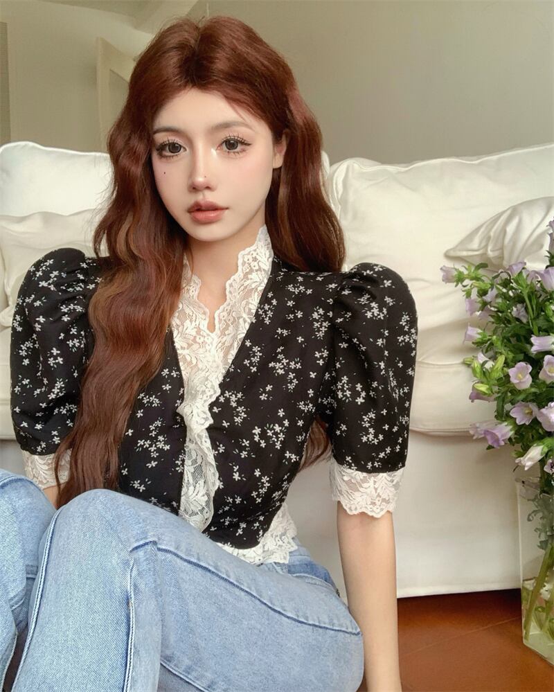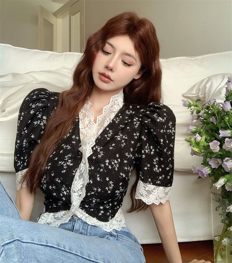 French temperament lace stitching V-neck floral shirt women's summer 2022 new gentle wind sweet short top ショート レース 大人ガーリー スウィート キュート カジュアル サマー 夏物 花柄 Vネック ステッチ 0921958429741525
