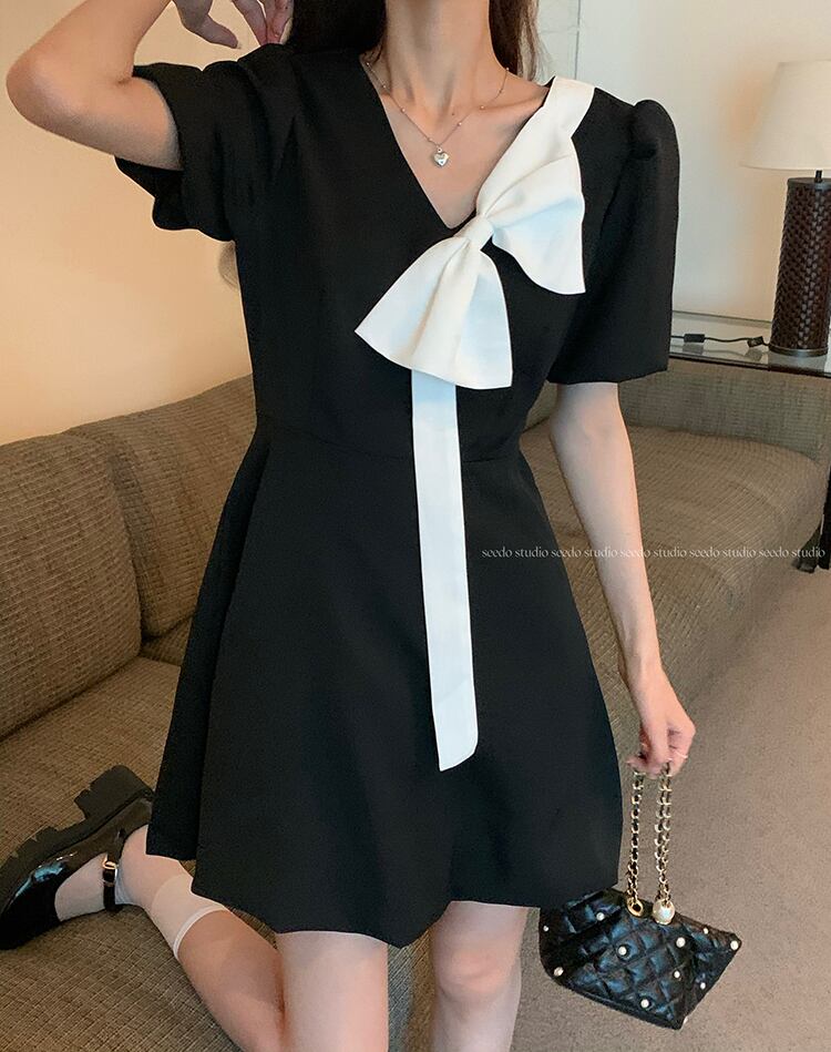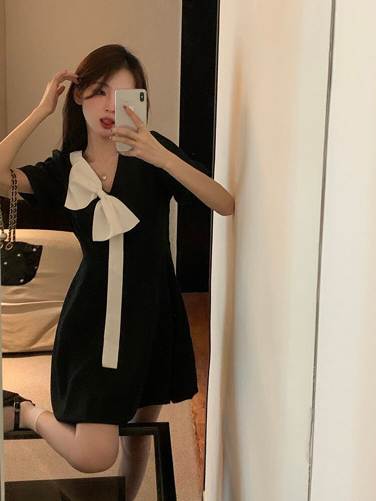 Bow-knot suit dress women's summer 2022 new Hepburn style v-neck little black dress with waist temperament a-line short skirt ショート ブラック サマー 夏物 スカート Vネック Aライン 0921987497464533