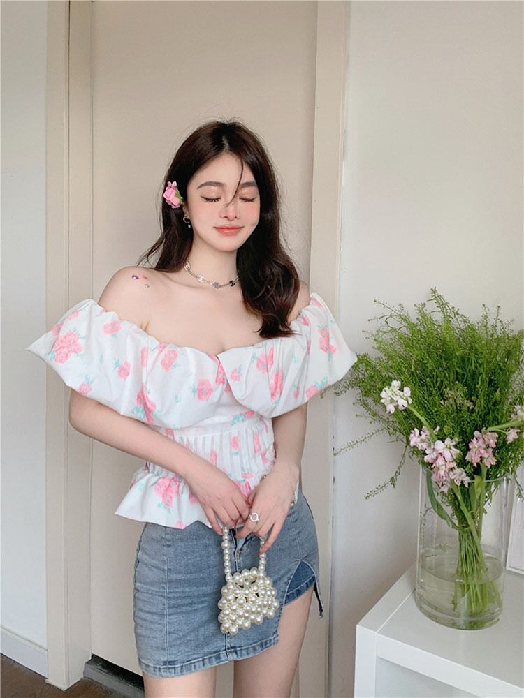 Chic floral one-shoulder shirt women's summer 2022 new design niche pleated waist short top trendy ショート プリーツ サマー 夏物 花柄 0921924142204231