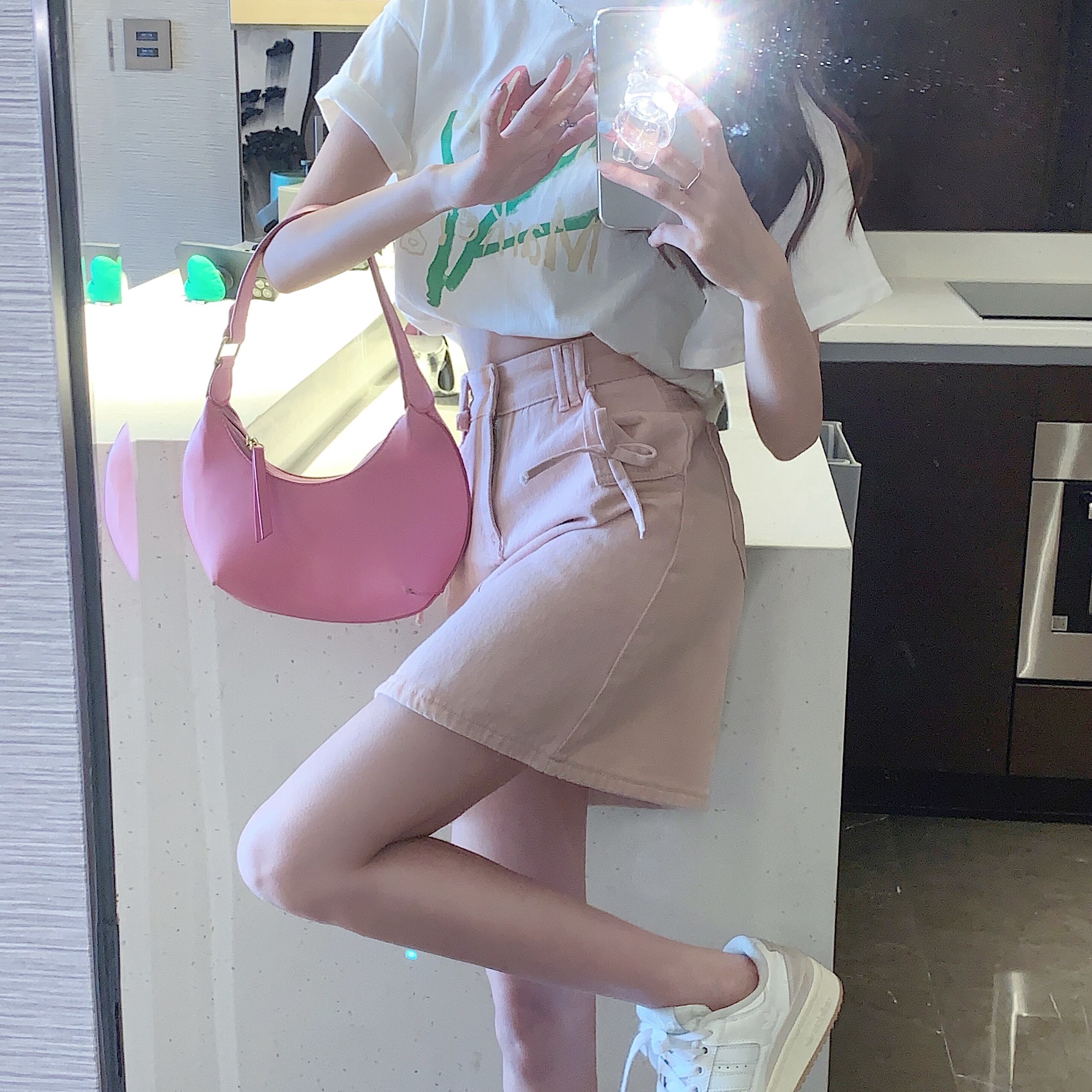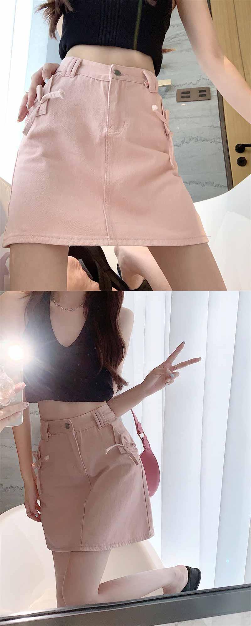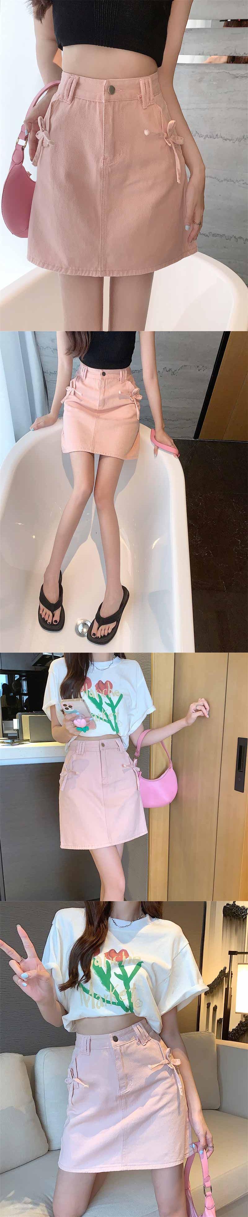 sense bow pink denim skirt women's summer 2022 new sweet high waist thin A-line skirt ハイウェスト ピンク リボン 大人ガーリー スウィート キュート カジュアル サマー 夏物 スカート Aライン 0921956453922600