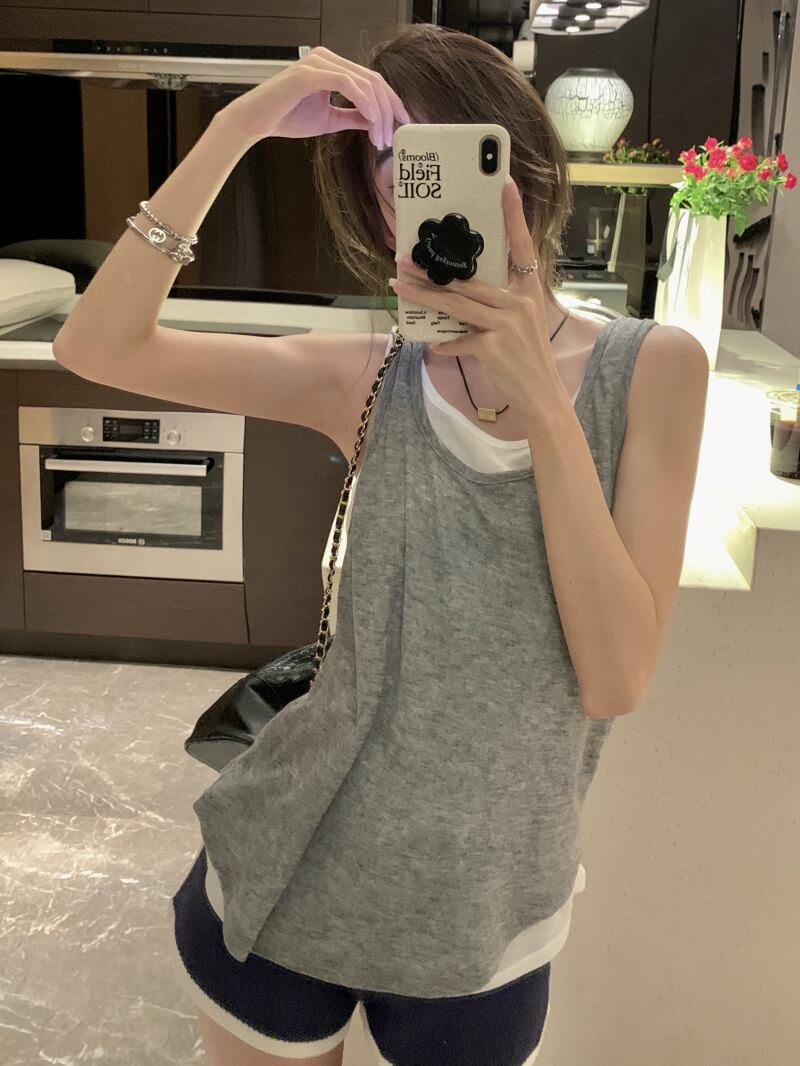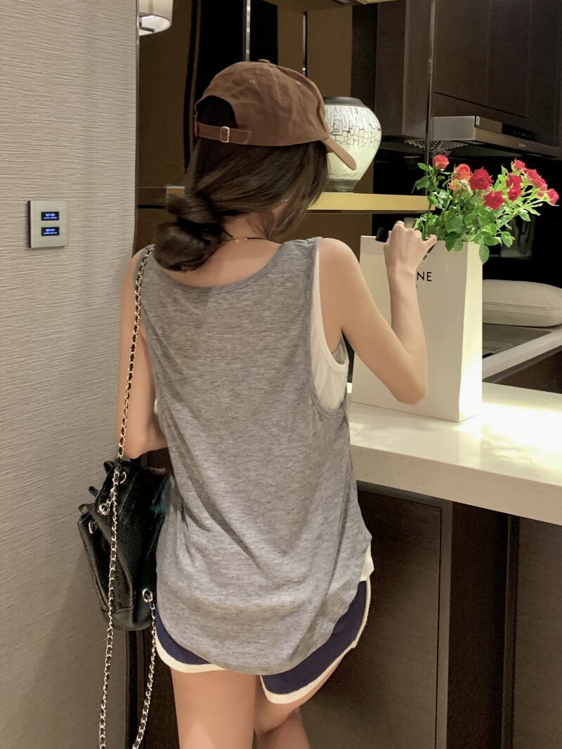Splicing fake two-piece sleeveless t-shirt women's ins tide summer 2022 new version of the wild casual slim fit thin top カジュアル サマー 夏物 ノースリーブ スリム Tシャツ 0921991686552355