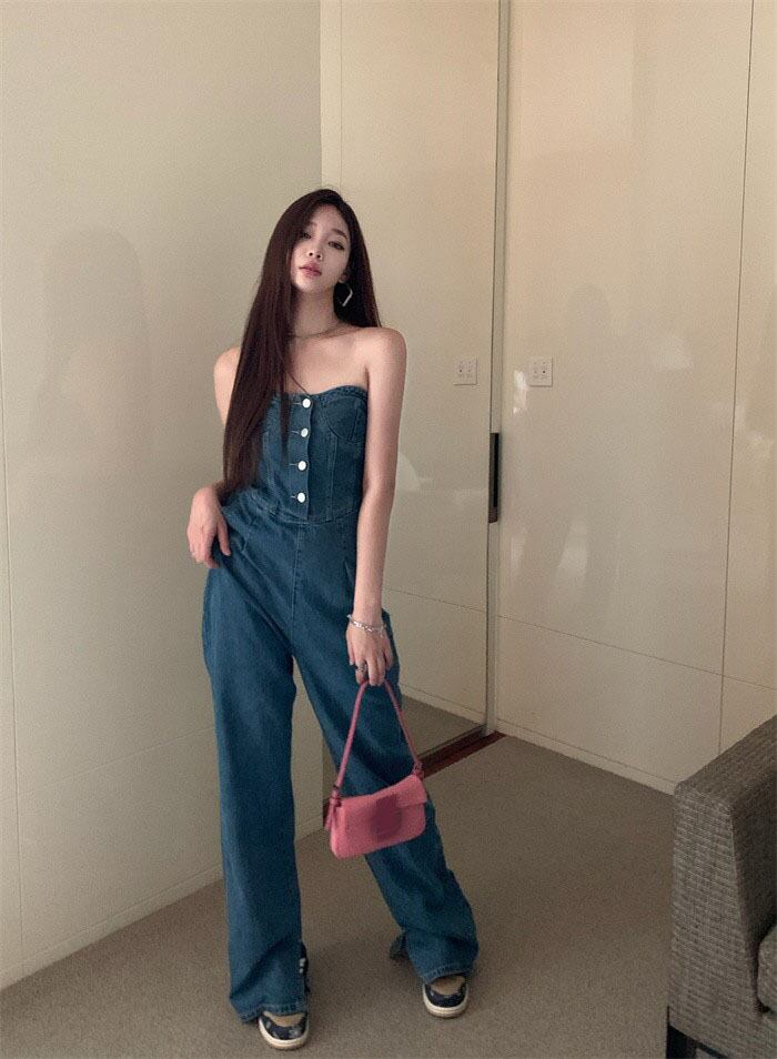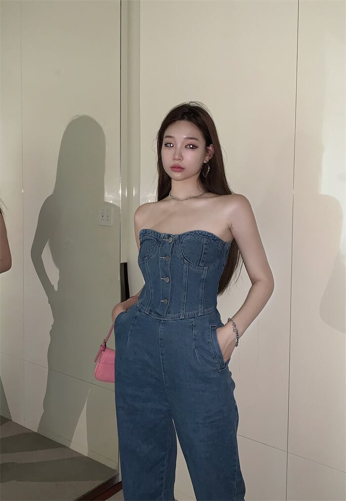 Retro denim jumpsuit women's summer 2022 new high-end tube top jumpsuit high waist loose wide leg pants tide ハイウェスト レトロ サマー 夏物 ワイドレッグ ワイドパンツ 0921971407776316