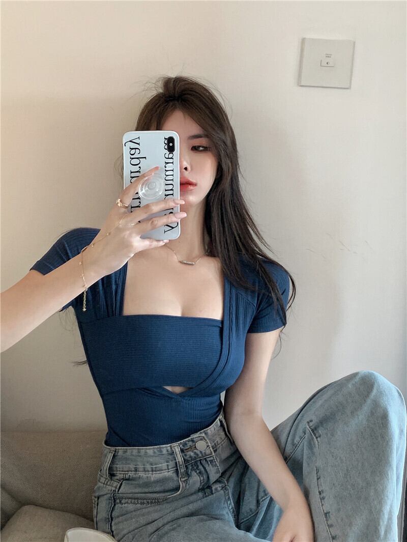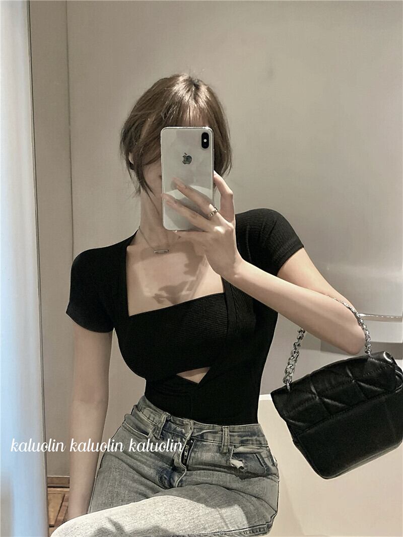 Hot fake two-piece short-sleeved t-shirt women's summer 2022 new sexy square-neck tight-fitting front-shoulder knitted short top ショート サマー 夏物 Tシャツ スクウェア 092191117233116