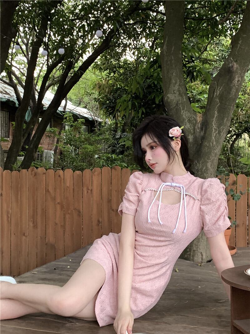 Pink puff sleeves improved cheongsam dress women's summer 2022 new design hollow waist bag hip skirt ピンク サマー 夏物 スカート 0921984371737683