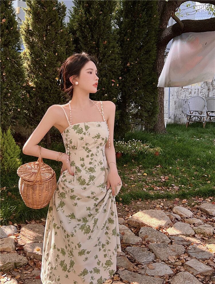 French floral pearl hanging neck suspender dress women's summer 2022 new waist mid-length temperament skirt trendy サマー 夏物 花柄 スカート パール 真珠 0921923878797524