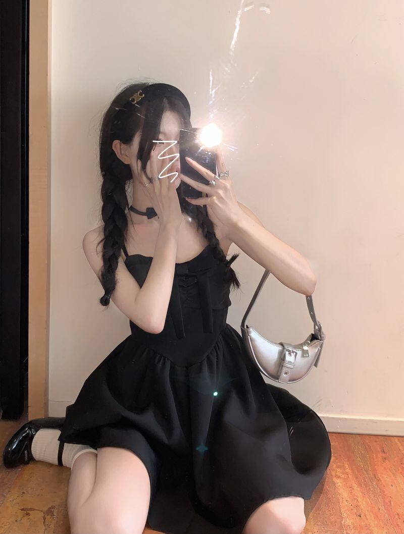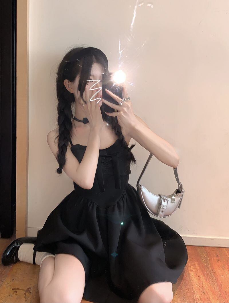 Dark black bow black suspender dress women's summer 2022 new chic small waist a-line skirt ブラック リボン サマー 夏物 スカート Aライン 0921927281818232