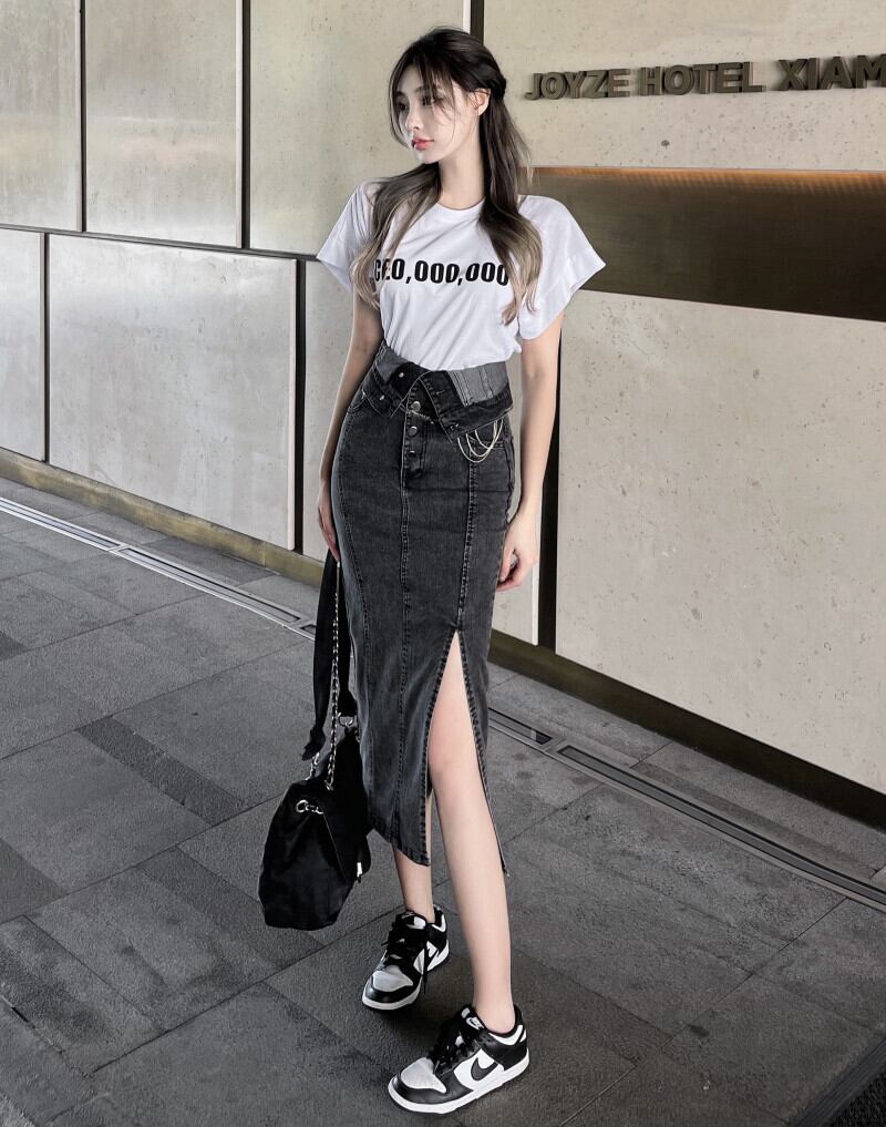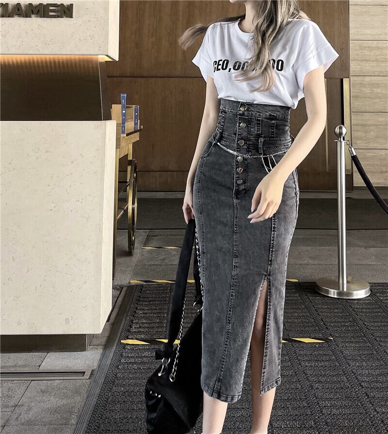 Retro design sense breasted cuff high waist denim skirt women's summer 2022 new mid-length slit skirt ハイウェスト レトロ サマー 夏物 スカート 0921922798464944