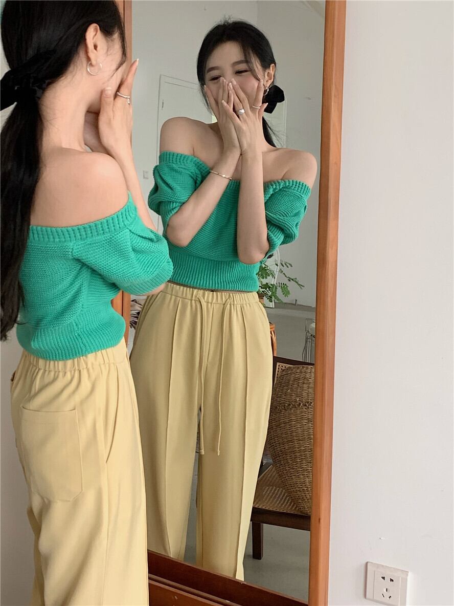 Hot one-shoulder striped short-sleeved t-shirt women's summer 2022 new temperament slim slim knitted short top ショート サマー 夏物 ストライプ スリム Tシャツ 0921981399063117