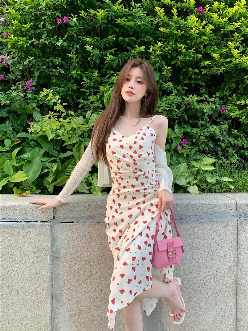 French rose floral suspender dress women's summer 2022 new light familiar style waist mid-length hip skirt サマー 夏物 花柄 スカート 0921997888056533