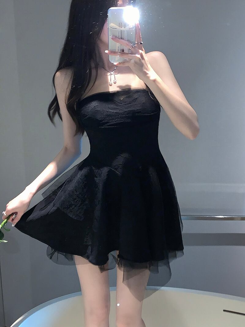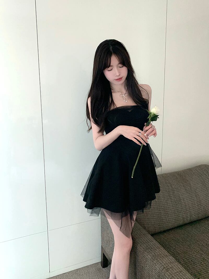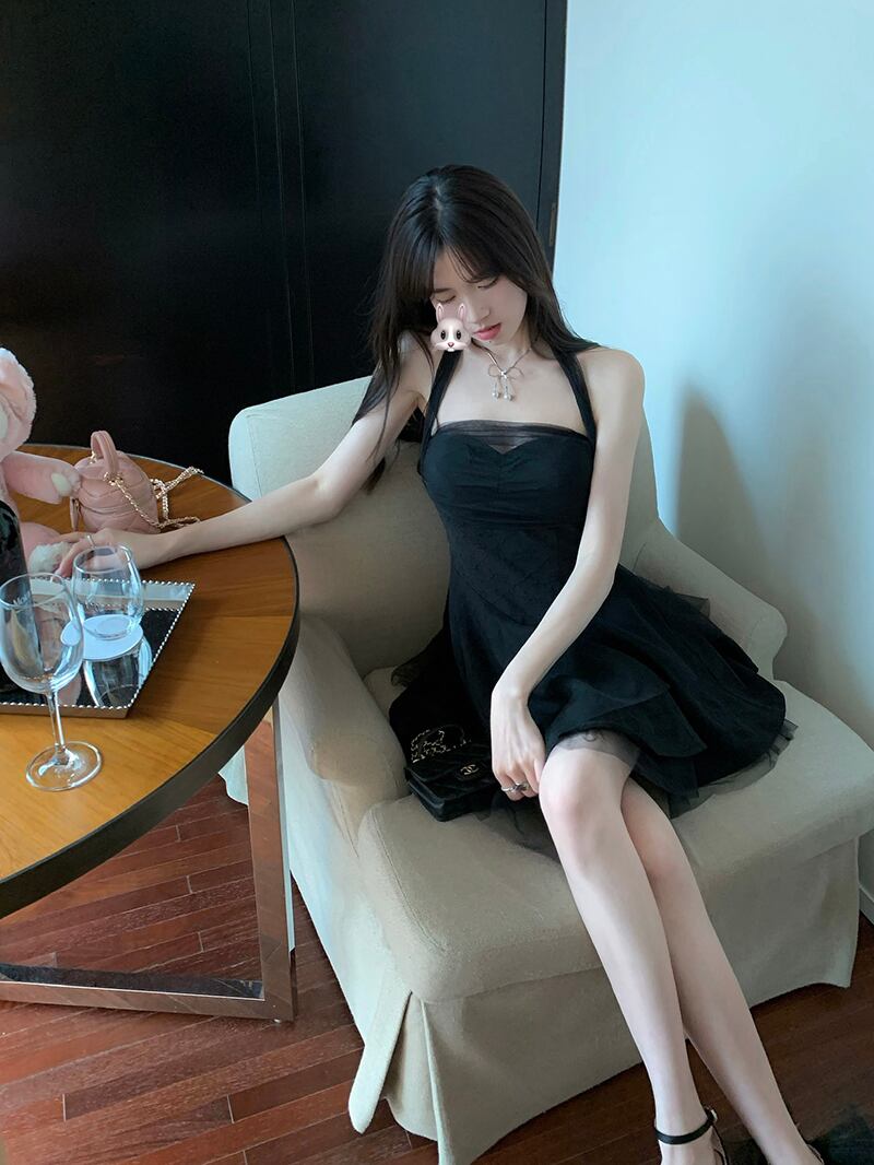 Pure desire style black halter dress female summer 2022 new design sense waist stitching mesh puffy skirt ブラック サマー 夏物 メッシュ スカート ステッチ 0921992156194852