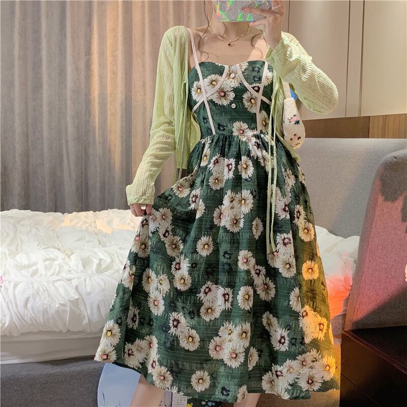 Retro floral suspender dress women's summer 2022 new style Western-style strappy bow waist mid-length skirt リボン レトロ サマー 夏物 花柄 スカート 0921950144701981