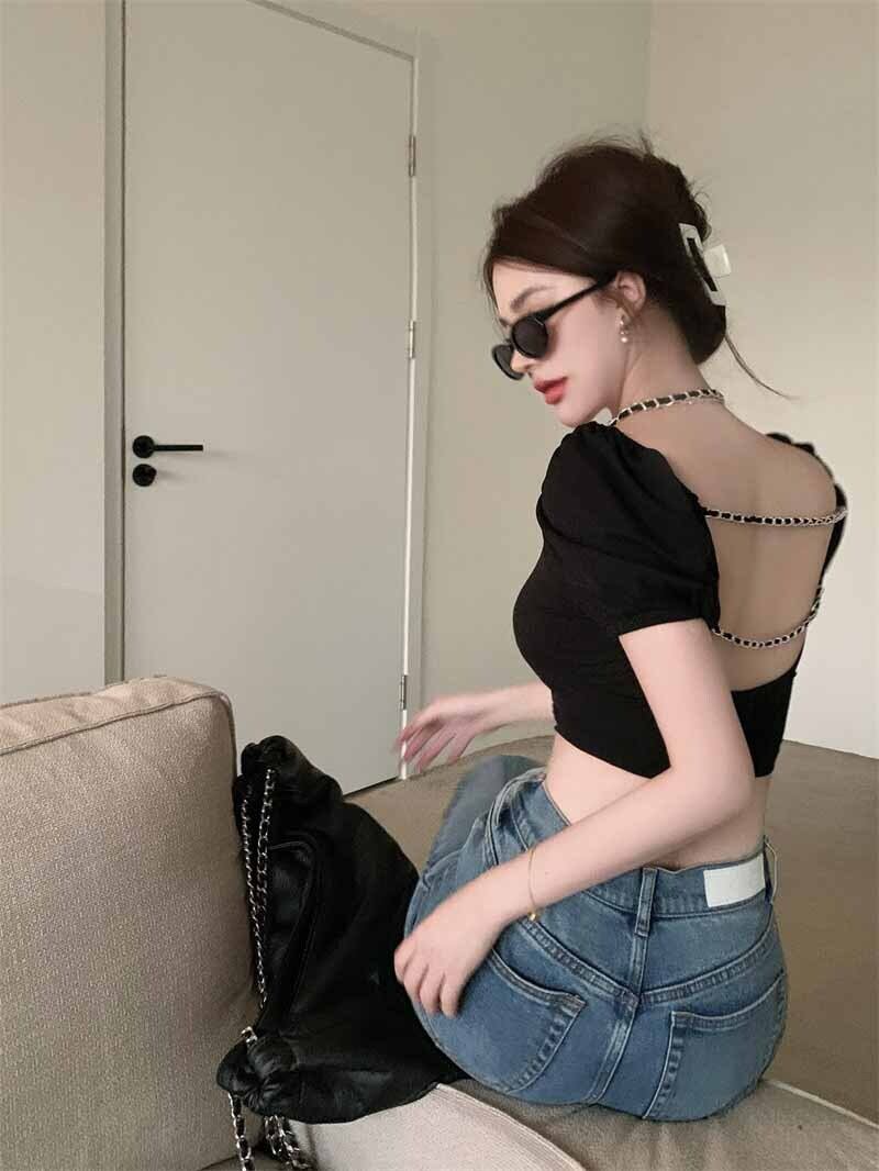 Hot sexy backless chain black short-sleeved T-shirt women's summer 2022 new temperament V-neck pleated short top ショート ブラック プリーツ サマー 夏物 Vネック Tシャツ チェーン 0921995244445249
