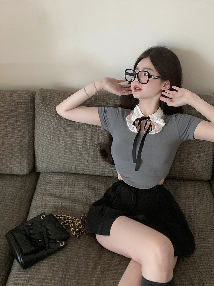 Stitching lace polo collar short-sleeved t-shirt women's summer 2022 new chic pure desire wind tight short top trend ショート レース サマー 夏物 Tシャツ ピュア ステッチ 0921975461828018