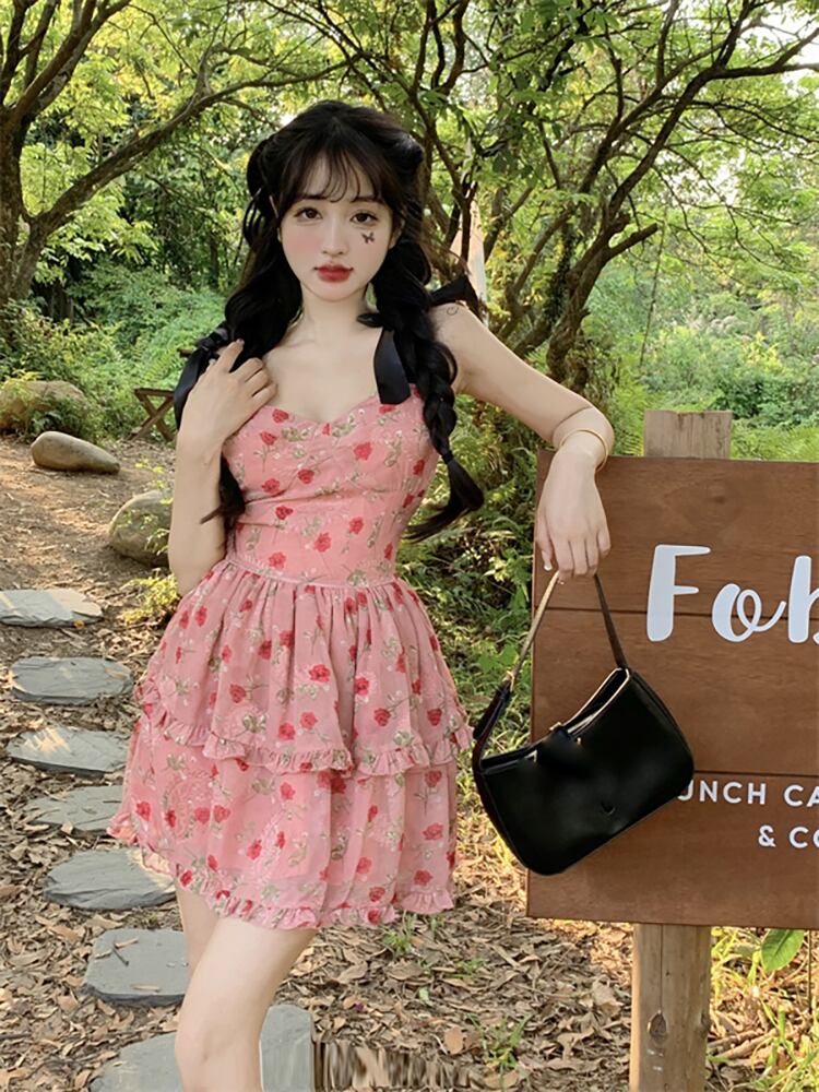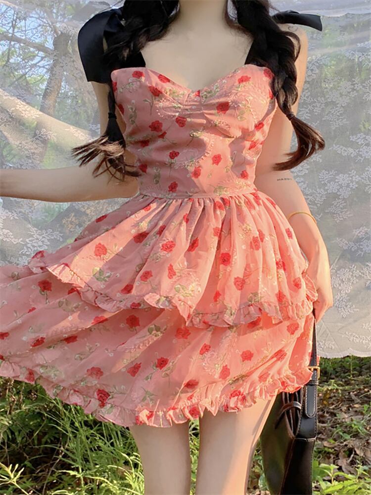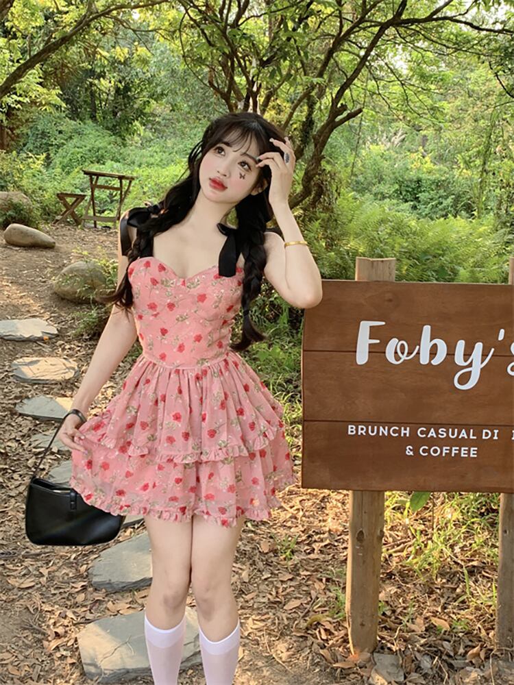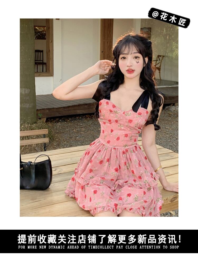 French floral suspender dress female summer 2022 new design pleated waist fungus edge cake skirt プリーツ サマー 夏物 花柄 スカート 0921986399166369