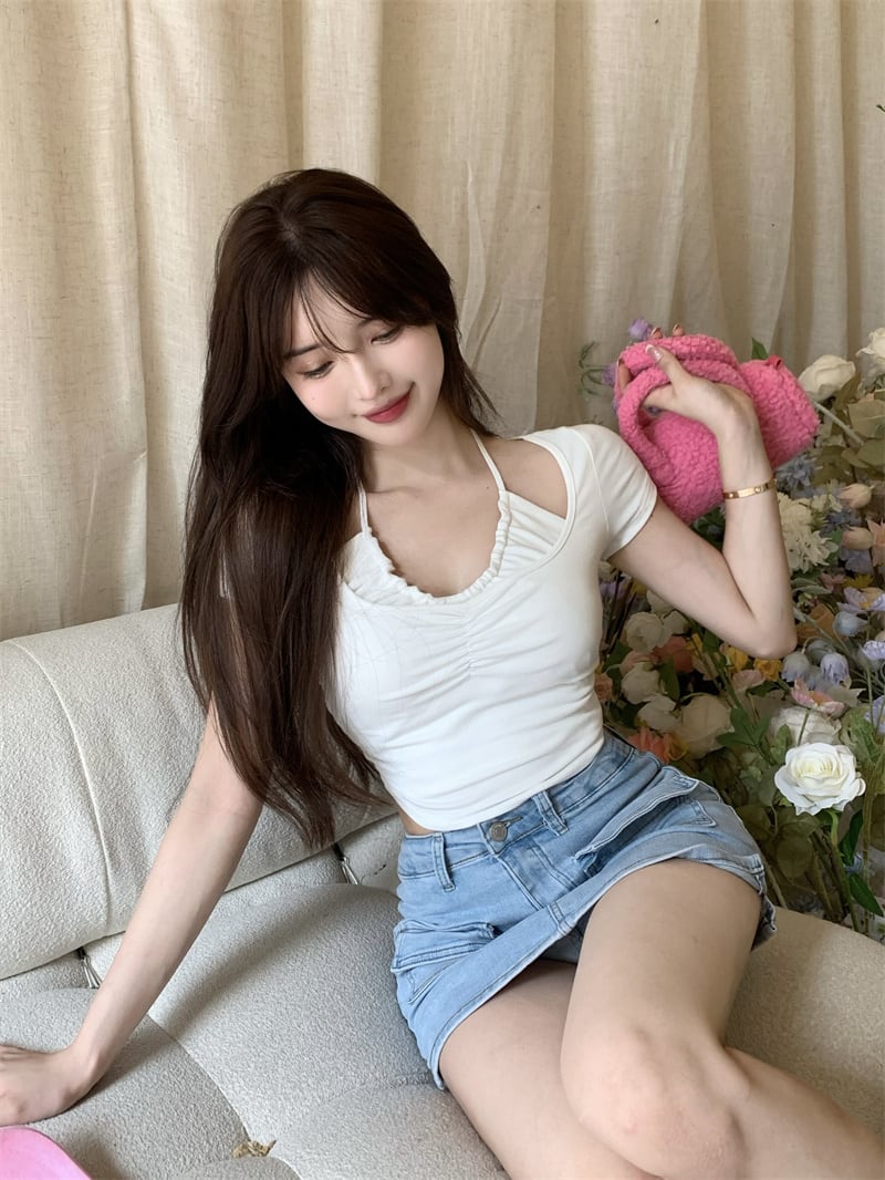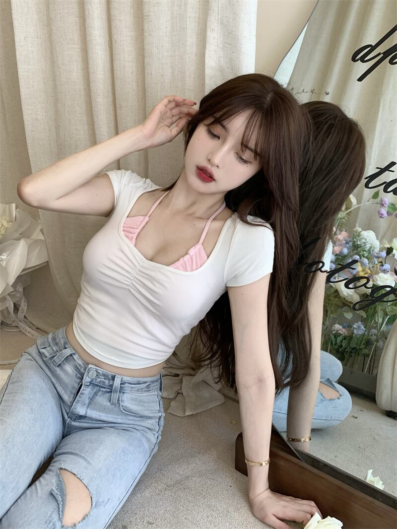 Pure desire chic pleated white short-sleeved T-shirt women's summer 2022 new temperament U-neck slim short top ins ショート ホワイト プリーツ サマー 夏物 スリム Tシャツ 0921995752122663