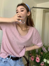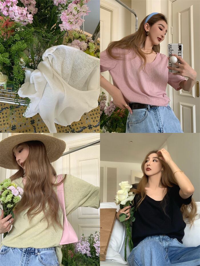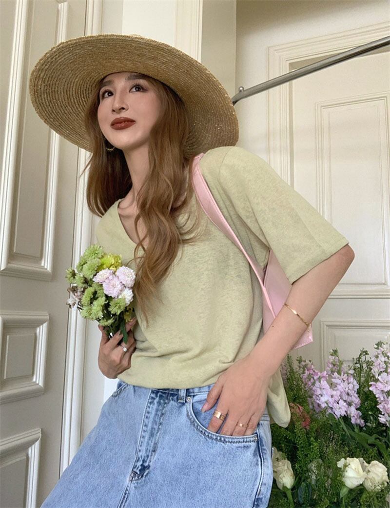 Lazy wind casual solid color short-sleeved T-shirt women's summer 2022 new version chic all-match U-neck slim top trendy カジュアル サマー 夏物 スリム Tシャツ ソリッドカラー 0921979741939312
