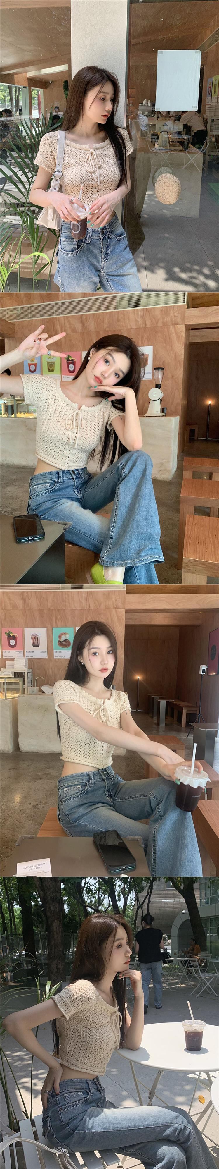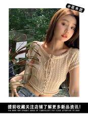 Small sweet lace-up short-sleeved T-shirt women's summer 2022 new temperament hollowed-out slim short knitted top ショート レース 大人ガーリー スウィート キュート カジュアル サマー 夏物 スリム Tシャツ レースアップ 092199204724851