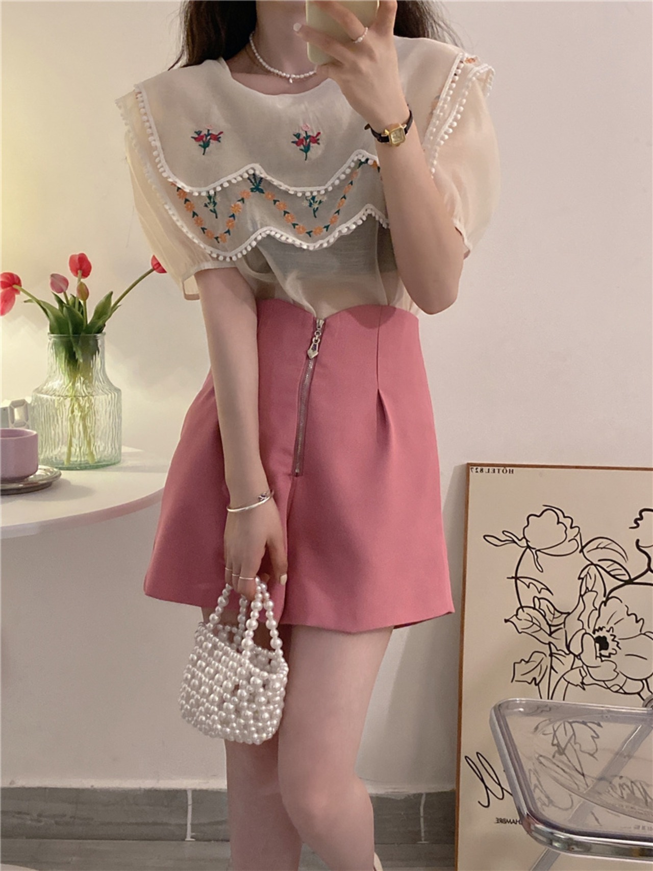 色:アプリコットembroideレッドトップ,ローズピンクshorts