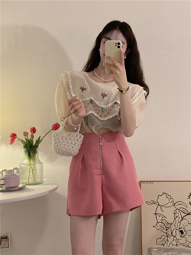 French chic embroidered double-layer doll collar shirt women's summer 2022 new gentle style temperament thin top trendy レッド 刺繍 サマー 夏物 0921991688818721