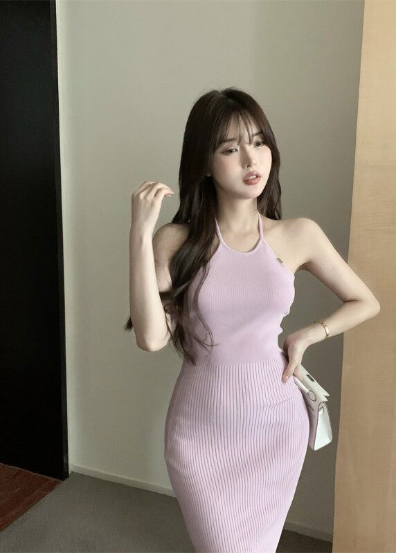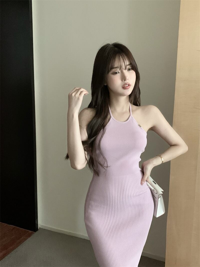 Hot purple knitted halter dress female summer 2022 new slim waist mid-length hip skirt trendy サマー 夏物 スカート スリム パープル 0921981583440722