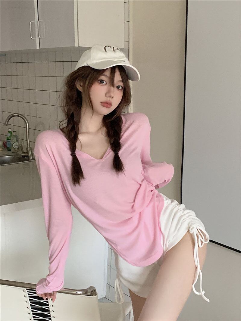 sense pink sunscreen long-sleeved T-shirt women's summer 2022 new version fashion chic chic slit top ロング ピンク サマー 夏物 Tシャツ 0921927685052008