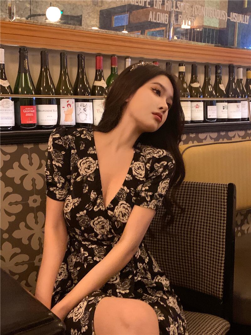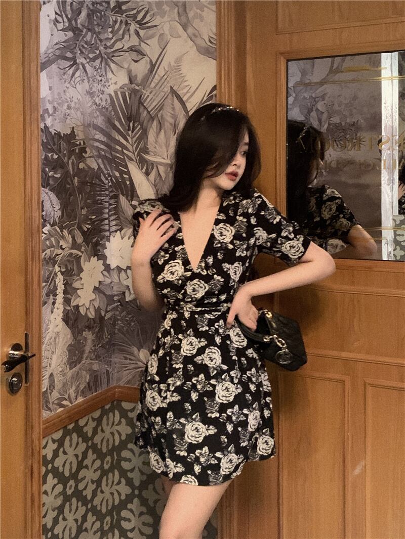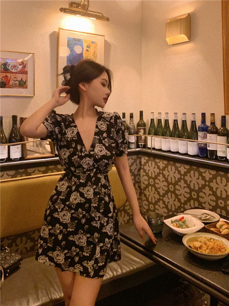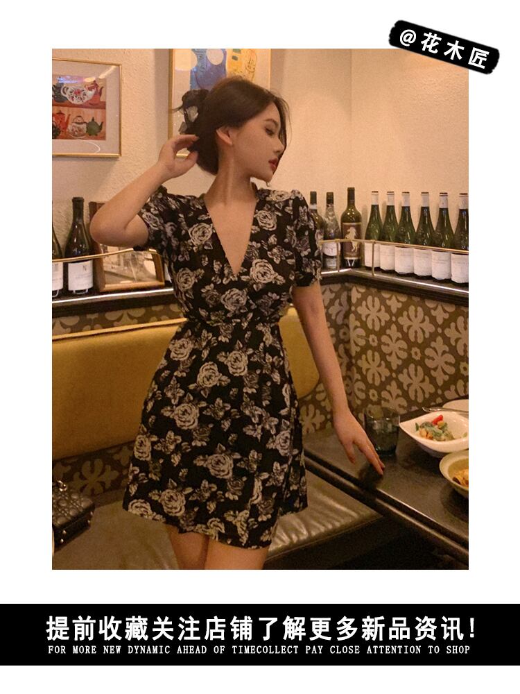 French retro short-sleeved floral dress women's summer 2022 new V-neck straps waist and thin A-line short skirt tide ショート レトロ サマー 夏物 花柄 スカート Vネック Aライン 0921960624765782