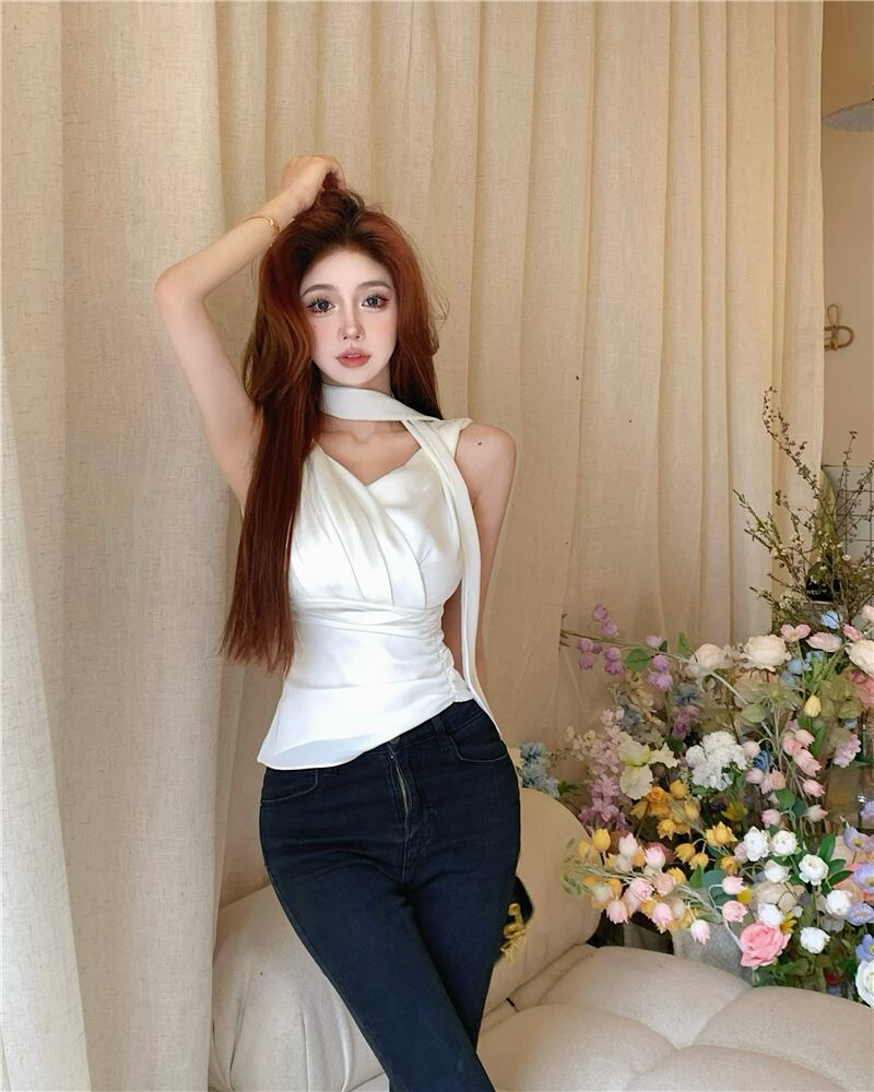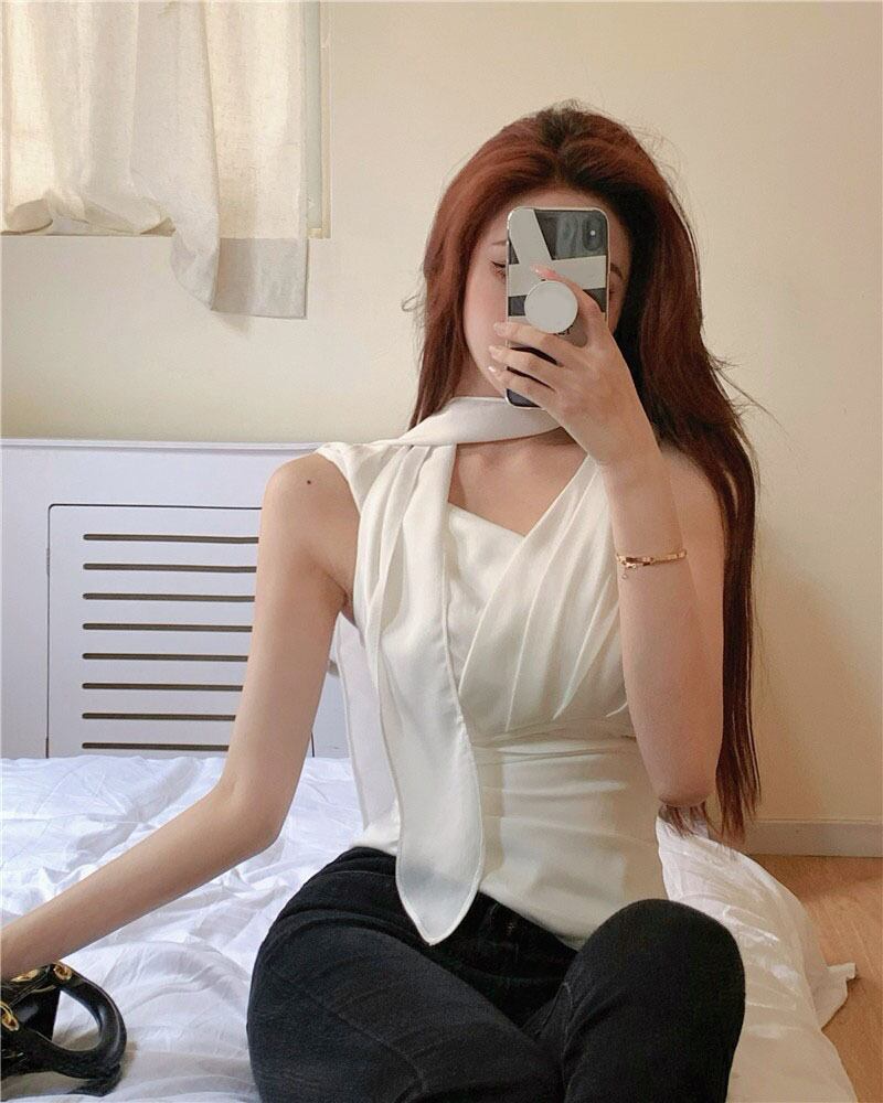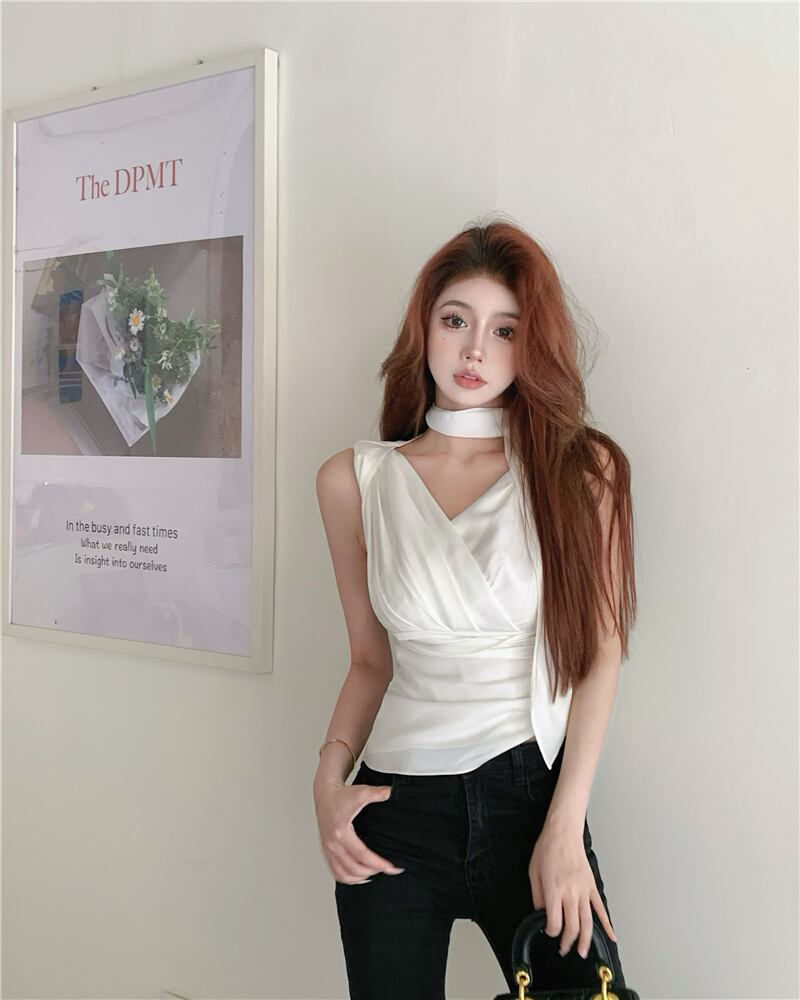 French temperament V-neck streamer white vest women's outer wear summer 2022 new high-end slim pleated top ホワイト プリーツ サマー 夏物 Vネック スリム 0921935915856970