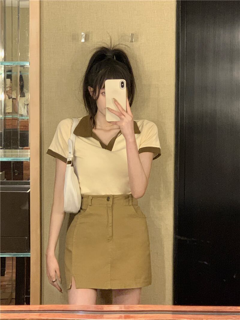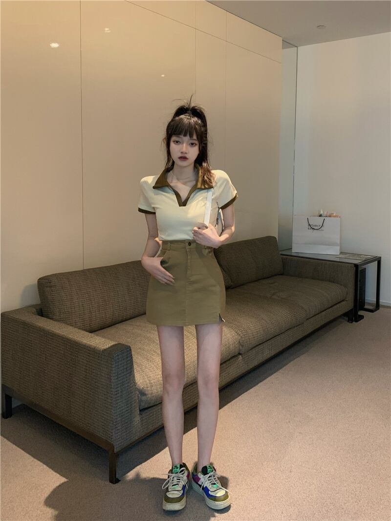 Small eign style contrast color polo collar short-sleeved T-shirt women's summer 2022 new version of the all-match short top trend ショート サマー 夏物 Tシャツ 0921936527481153