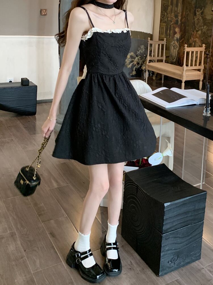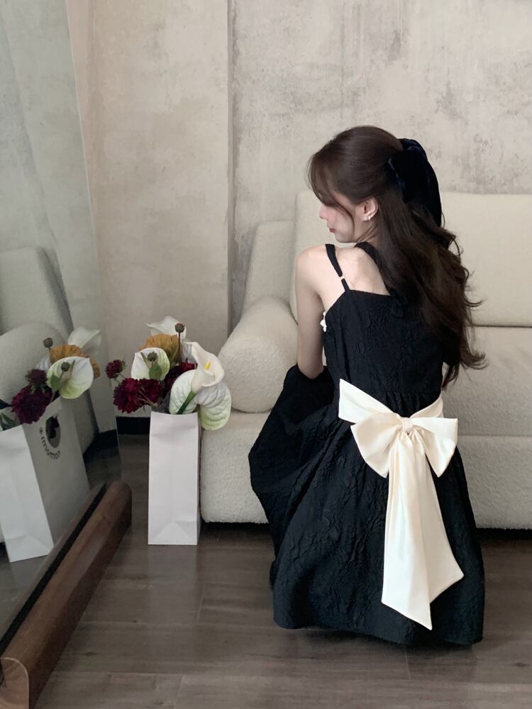 Contrast color bow suspender dress women's summer 2022 new Hepburn style small waist and thin A-line skirt リボン サマー 夏物 スカート Aライン 0921973479598893