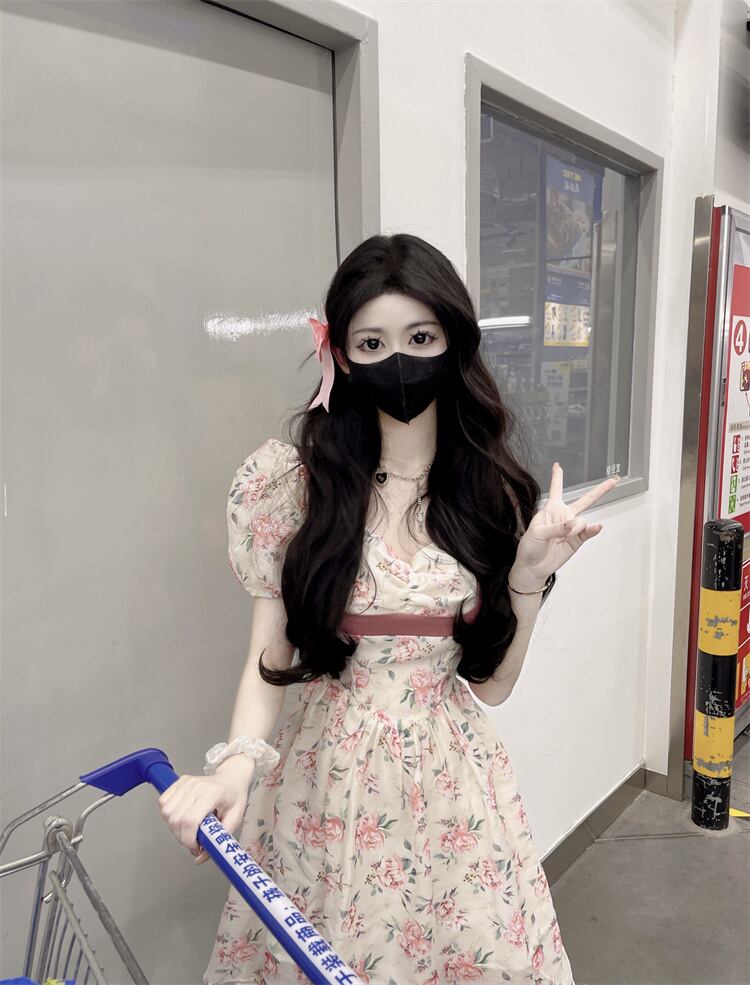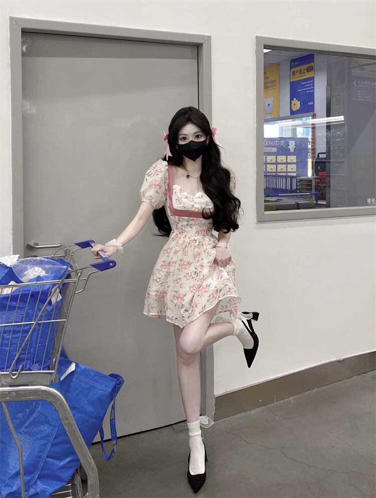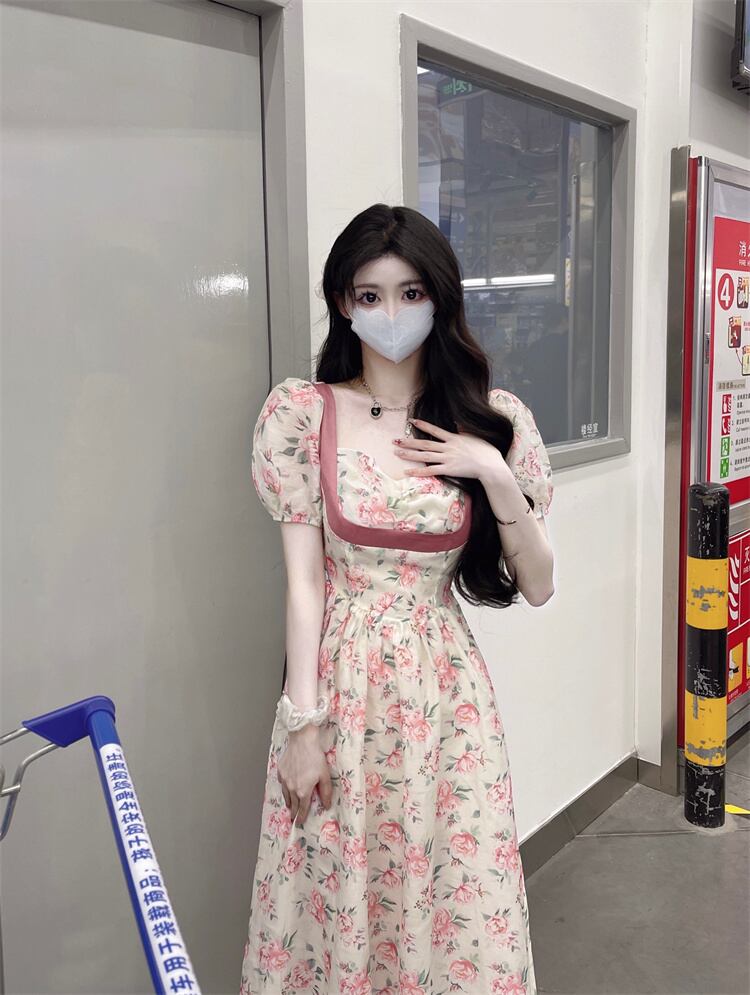 Retro gentle wind floral dress female summer 2022 new chic puff sleeves waist mid-length a-line skirt レトロ サマー 夏物 花柄 スカート Aライン 0921994062015334