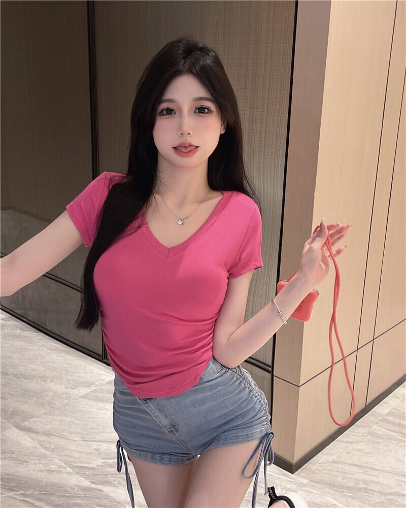 scheming v-neck short-sleeved t-shirt women's summer 2022 new version all-match pleated solid color inner tight-fitting pure desire top プリーツ サマー 夏物 Vネック Tシャツ ピュア ソリッドカラー 0921932537288222