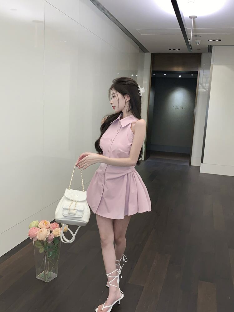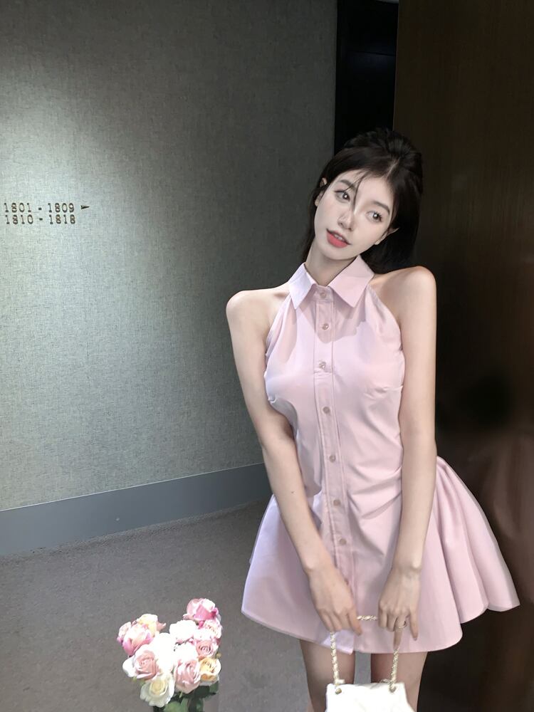 Pure desire style pink polo collar halter dress women's summer 2022 new design waist a-line shirt skirt ピンク サマー 夏物 スカート Aライン 0921973957072111