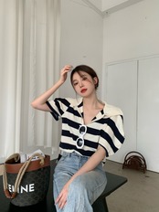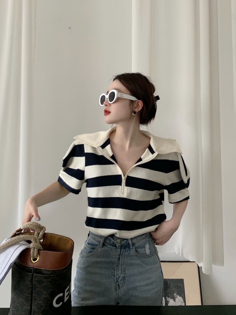 sense zipper polo collar striped short-sleeved T-shirt women's summer 2022 new all-match thin shoulder top trendy サマー 夏物 ストライプ Tシャツ 0921917173698256