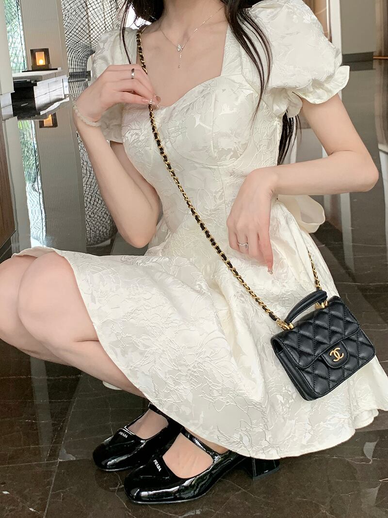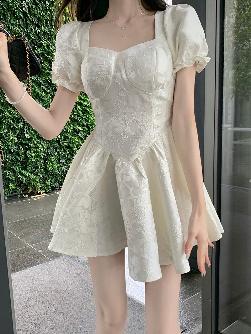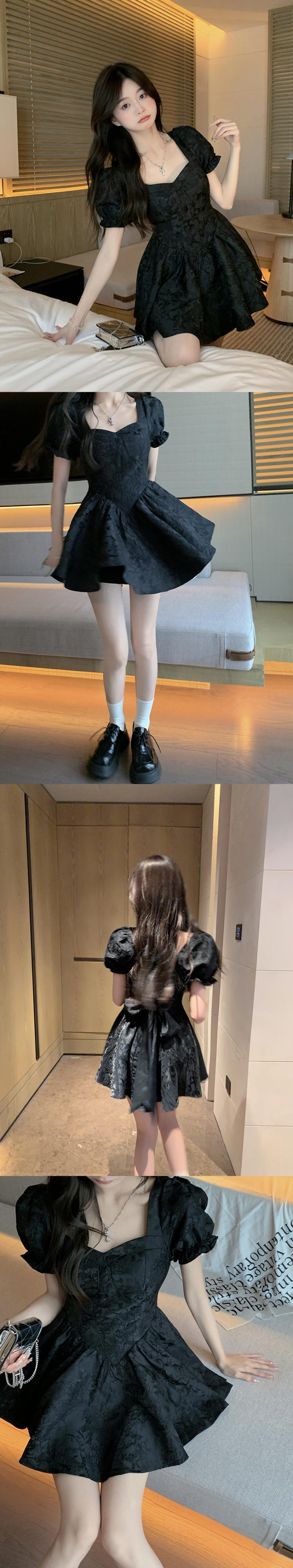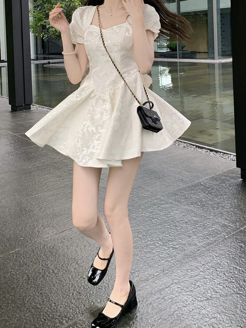 French jacquard tie bow puff sleeve dress female summer 2022 new small waist tutu skirt リボン サマー 夏物 スカート パニエ ペチコート 0921952777450894