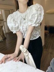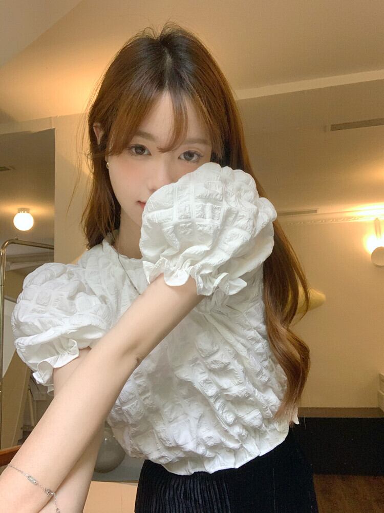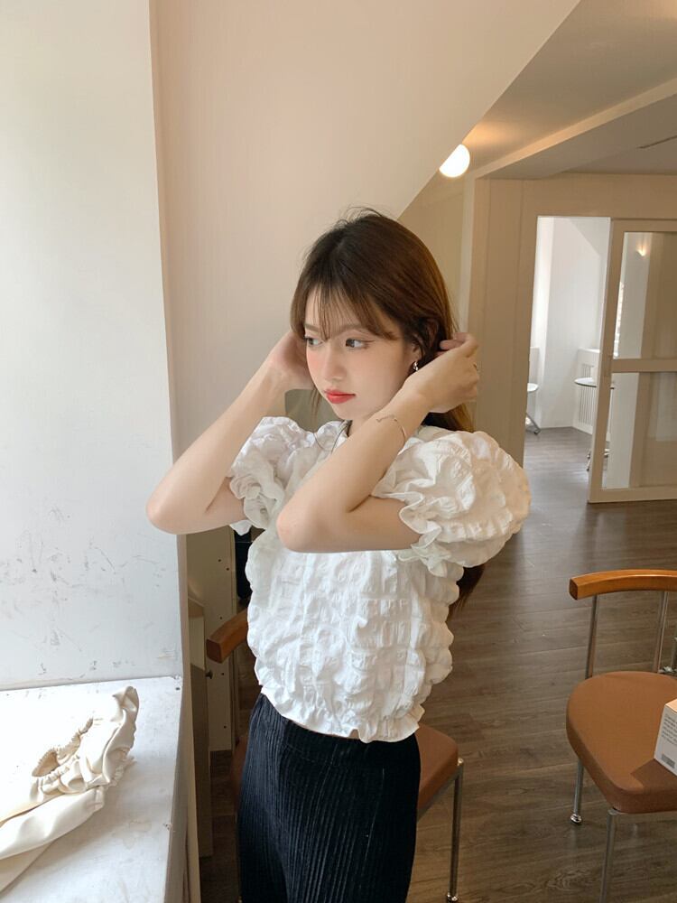 French white puff sleeve shirt women's summer 2022 new design niche pleated slim short top ショート ホワイト プリーツ サマー 夏物 スリム 0921937669614122