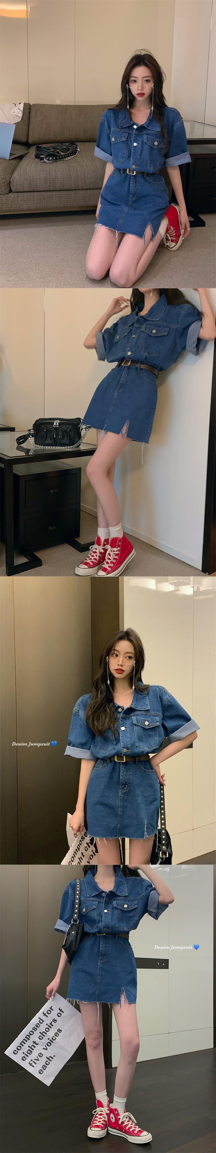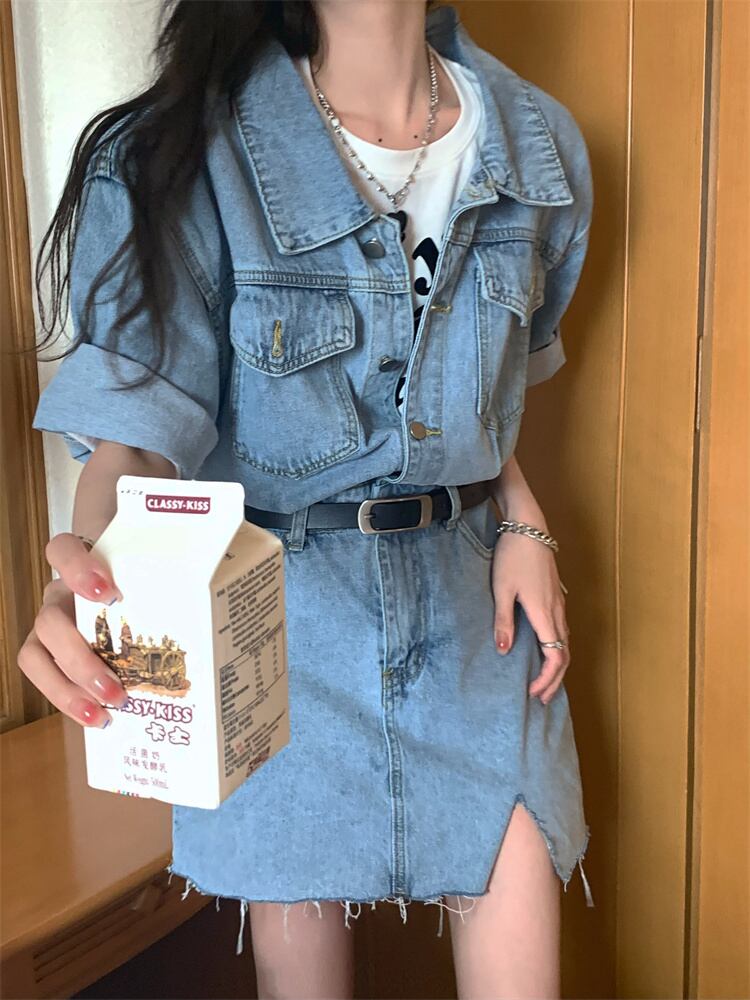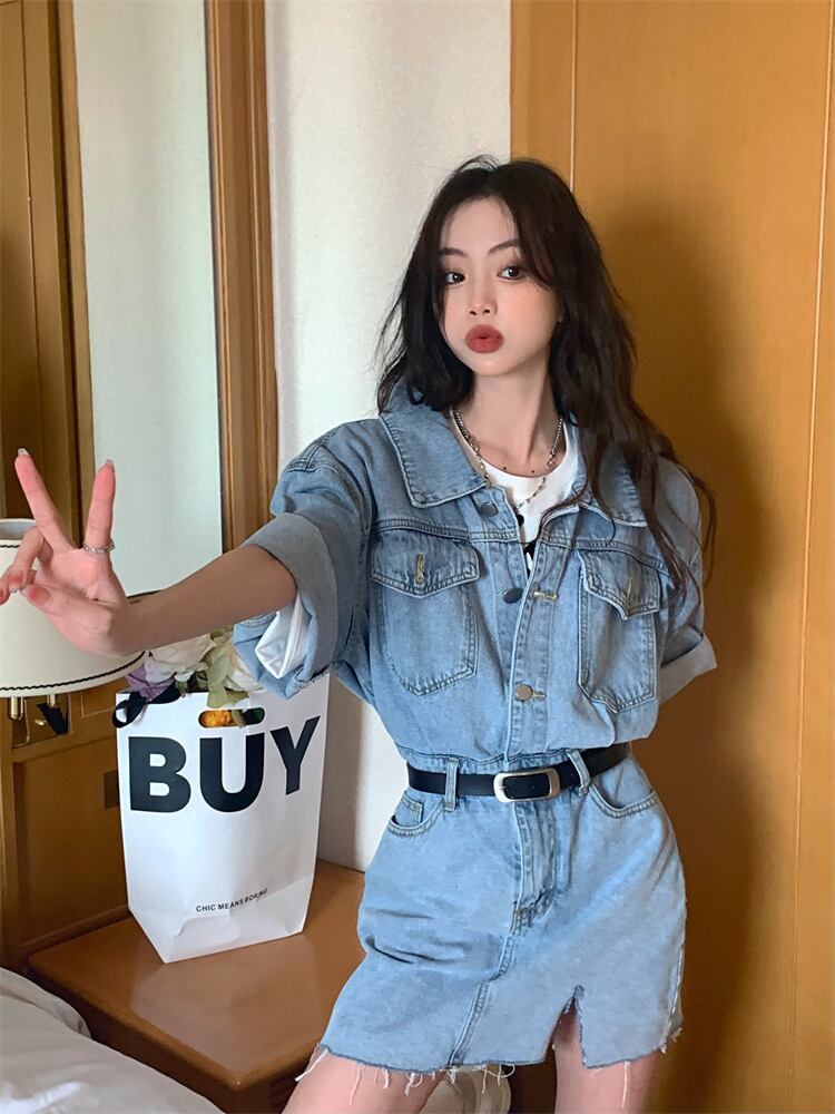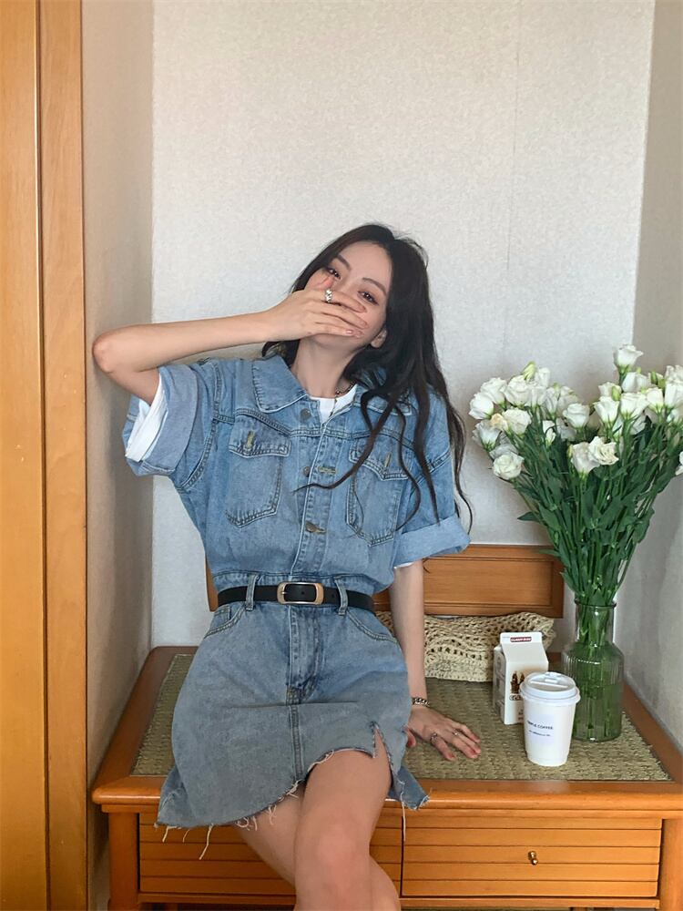 Retro Hong Kong flavor chic short-sleeved denim dress women's summer 2022 new waist and thin split a-line skirt レトロ サマー 夏物 スカート Aライン 0921948556496745