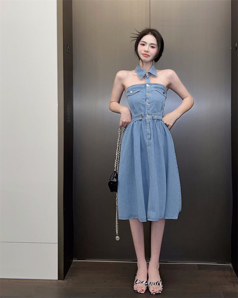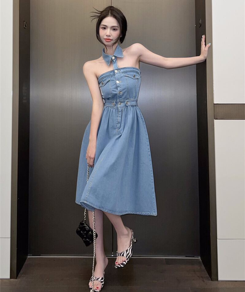 Sexy backless halter denim dress women's summer 2022 new waist and thin mid-length A-line skirt trendy サマー 夏物 スカート Aライン 0921948539235173