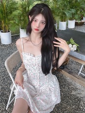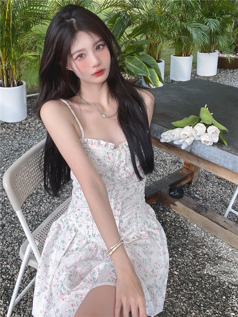 Small sweet fungus edge sling floral dress female summer 2022 new temperament waist A-line skirt 大人ガーリー スウィート キュート カジュアル サマー 夏物 花柄 スカート Aライン 0921913382789637