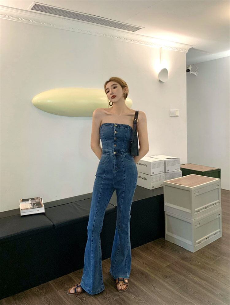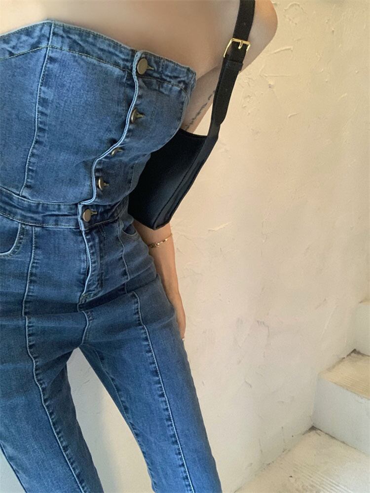 Retro temperament one-shoulder tube top denim jumpsuit women's summer 2022 new waist-waisted slim flared pants tide レッド レトロ サマー 夏物 スリム 0921979438948858